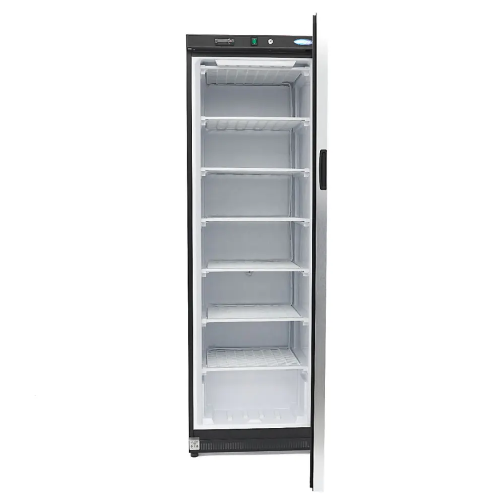 Tato profesionální mraznička má celkovou kapacitu 400 l pro skladování zmrazených produktů. Tato černá mraznička se bez problémů hodí do většiny profesionálních kuchyní. Je vybavena šesti pevnými policemi, které poskytují dostatečný úložný prostor. Police jsou navrženy v mřížkovaném vzoru, který zlepšuje větrání. Skleněné dveře jsou opatřeny zámkem, který umožňuje prohlížet zmrazené produkty, aniž byste museli chladničku otevírat.