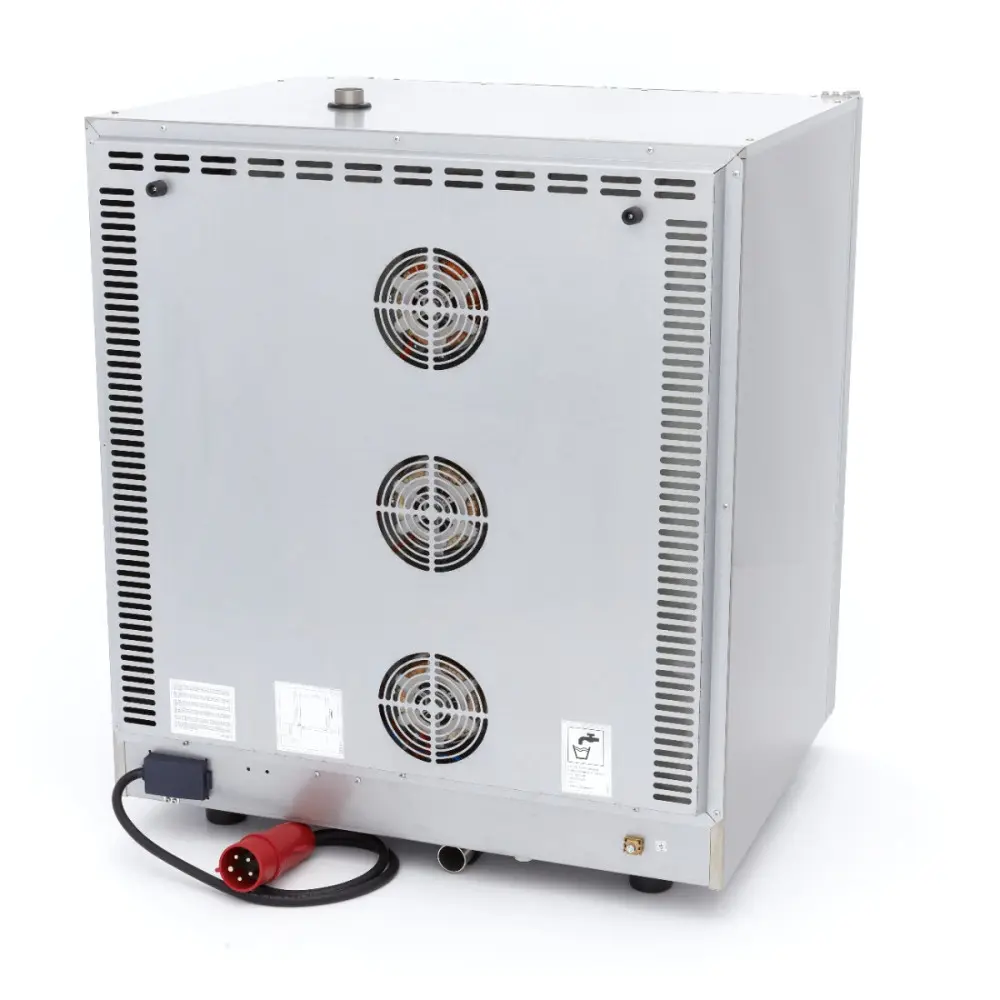 Tato kombinovaná parní trouba má výkonná topná tělesa z nerezové oceli, která zajišťují úplné a účinné rozložení tepla, takže maso a ryby se připravují rovnoměrně. Kromě toho je konvektomat vybaven třemi ventilátory s reverzní funkcí a dvojitým atermickým zasklením. Dvířka se velmi snadno nastavují a těsnění dvířek je vyrobeno z potravinářského silikonu. Díky vnitřnímu osvětlení snadno zjistíte, jak daleko jste v procesu vaření. Tento spotřebič je vybaven přívodem vody s ventilem pro výrobu páry a také vývodem vody. Jedná se o zcela přizpůsobitelný přístroj s jednoduchým digitálním displejem a dotykovými tlačítky. K dispozici je několik přednastavených programů se třemi nastavitelnými fázemi, včetně úrovně páry, teploty a času. Přednastavené programy můžete nastavit pomocí tlačítka fáze. Přednastavený program je také možné upravit a uložit do paměti konvektomatu.