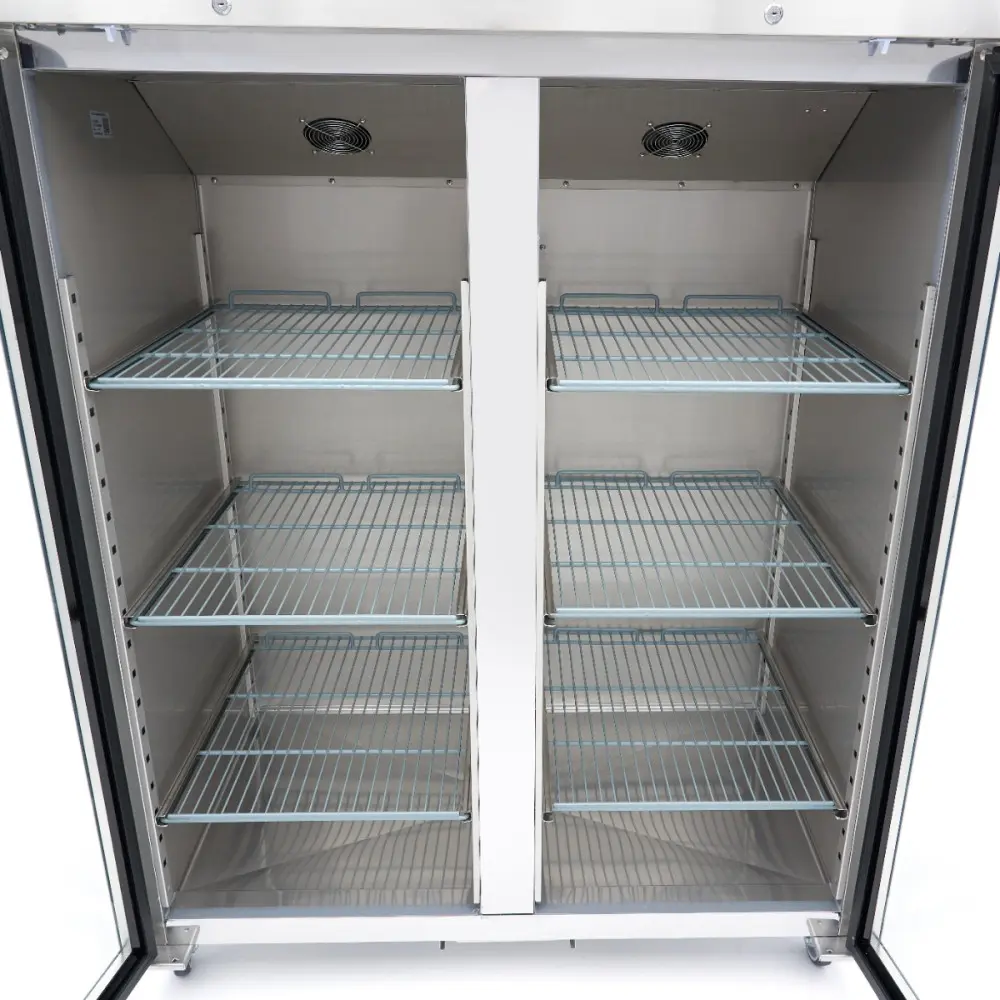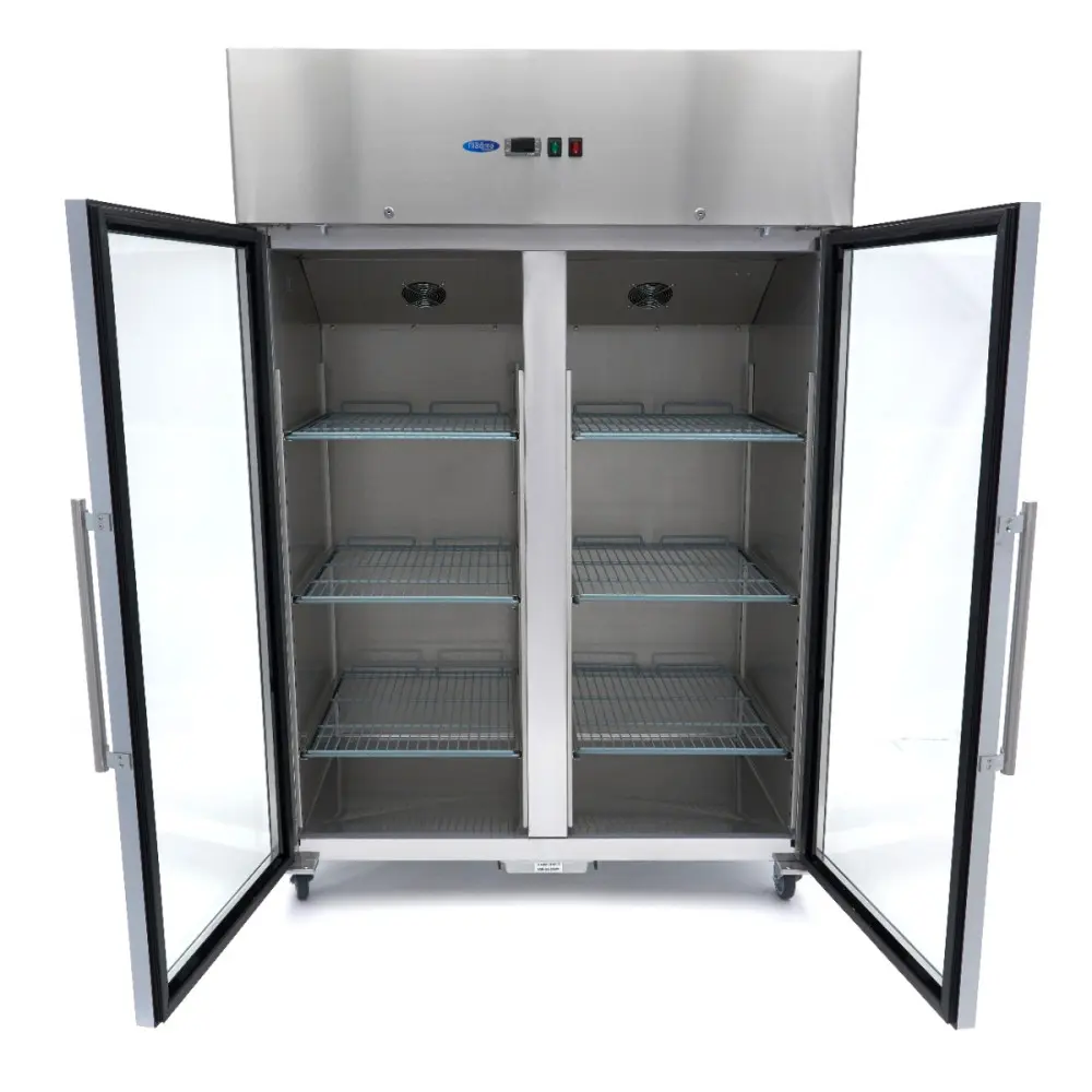 Tato mraznička z nerezové oceli má celkovou kapacitu 1200 l pro skladování zmrazených produktů a bez problémů se hodí do většiny profesionálních kuchyní. Vnitřní prostor je vybaven energeticky úsporným LED osvětlením a šesti nastavitelnými policemi, které jsou vhodné pro nádoby 2/1 GN. Skleněné dveře s antibakteriálním pryžovým těsněním obsahují vestavěný zámek a umožňují prohlížet zmrazené produkty bez nutnosti mrazničku otevírat.