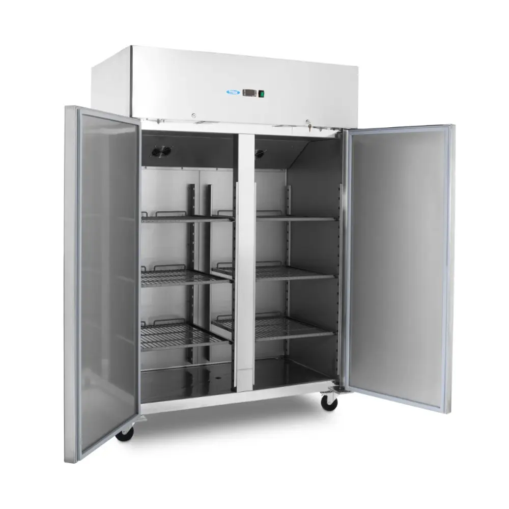 Tato profesionální mraznička z nerezové oceli má objem 800 l. Je vybavena dvojitými samozavíracími dveřmi, LED osvětlením a šesti výškově nastavitelnými policemi, které usnadňují přizpůsobení uspořádání podle potřeby. Díky čtyřem kolečkům ji navíc můžete přemístit na to nejlepší místo v kuchyni.