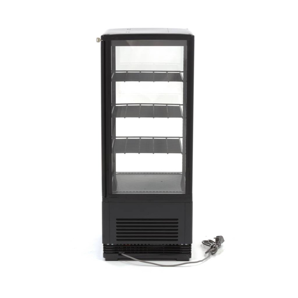 Díky objemu 78 litrů a třem dodávaným policím má tato robustní chladicí vitrína dostatek prostoru pro chlazení a prezentaci široké škály výrobků, jako jsou sendviče, nápoje, saláty a mléčné výrobky. Chladicí vitrína je nejen velmi praktická, ale díky čtyřem skleněným oknům a zabudovanému LED osvětlení je také ideální pro prezentaci výrobků. Je velmi vhodná pro pekárny nebo gastronomické provozy, aby zákazníkům ukázala nabízené výrobky. Další výhodou mini chladicí vitríny je, že má pevné nohy a obsahuje zámek se dvěma klíči.