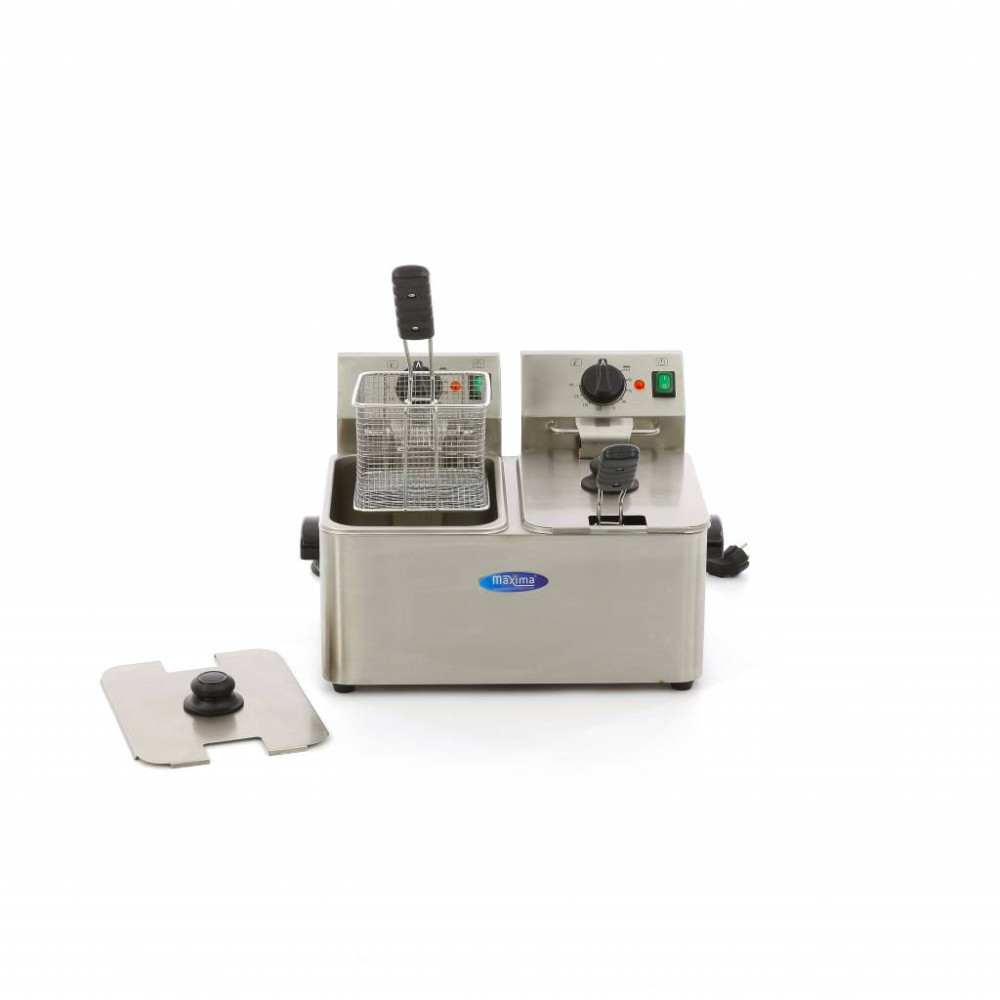 Tato dvojitá fritéza z nerezové oceli má dvě nádrže o objemu přibližně dva litry oleje. V každém koši můžete současně smažit 1 kg hranolek nebo občerstvení. Tento model se dodává se dvěma koši a dvěma víky. Nádrže jsou vyjímatelné, což usnadňuje čištění této fritézy.