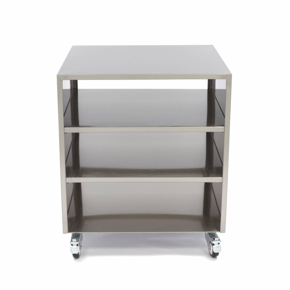 Profesionální kuchyně se neobejde bez nerezového stolu. Tento stůl má rozměry 60 x 60 cm a lze na něj umístit kuchyňské vybavení nebo uložit věci do jedné ze tří přihrádek. Díky čtyřem stabilním kolečkům s brzdou lze s tímto stolem snadno přemisťovat i kuchyňské náčiní.