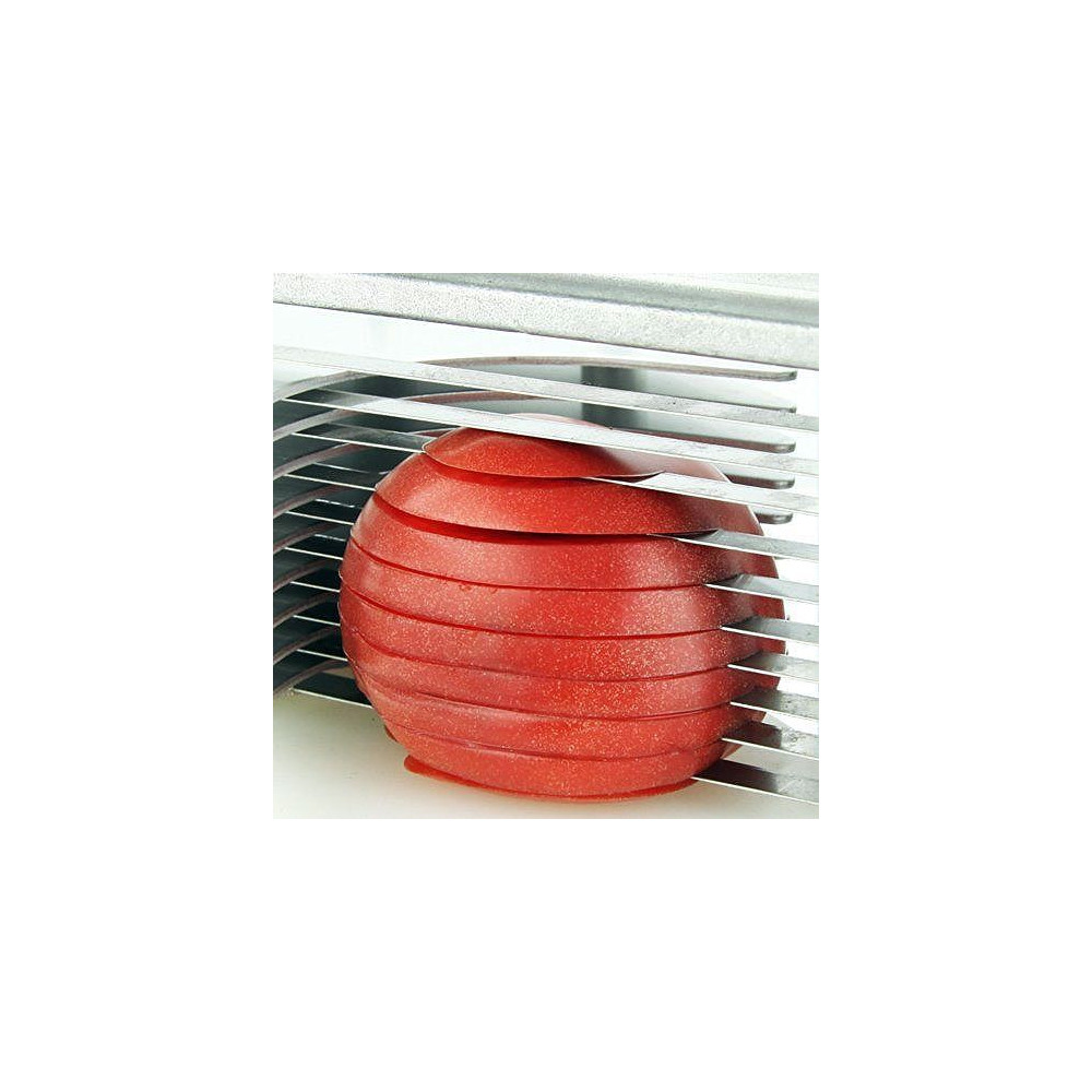 S tímto profesionálním kráječem na rajčata můžete rychle a bezpečně krájet dokonalé plátky rajčat o tloušťce 4 mm. Vroubkované čepele z nerezové oceli jsou velmi ostré, ale díky protlačovací rukojeti můžete rajčata krájet bezpečně. Kromě rajčat můžete s tímto kráječem na rajčata krájet i jiné produkty, například kiwi.