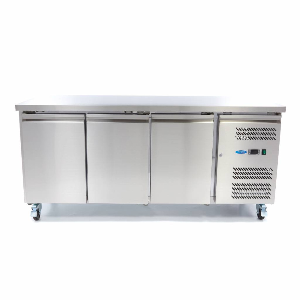 Tento pultový mrazák z nerezové oceli má troje dveře a za každými dveřmi je výškově nastavitelný rošt. Má digitální displej, funkci automatického odmrazování a kolečka pro snadné přemisťování. Pultový mrazák udržuje zmrazené maso, ryby, zeleninu atd. při dokonalé teplotě, což je v profesionální kuchyni nepostradatelné.