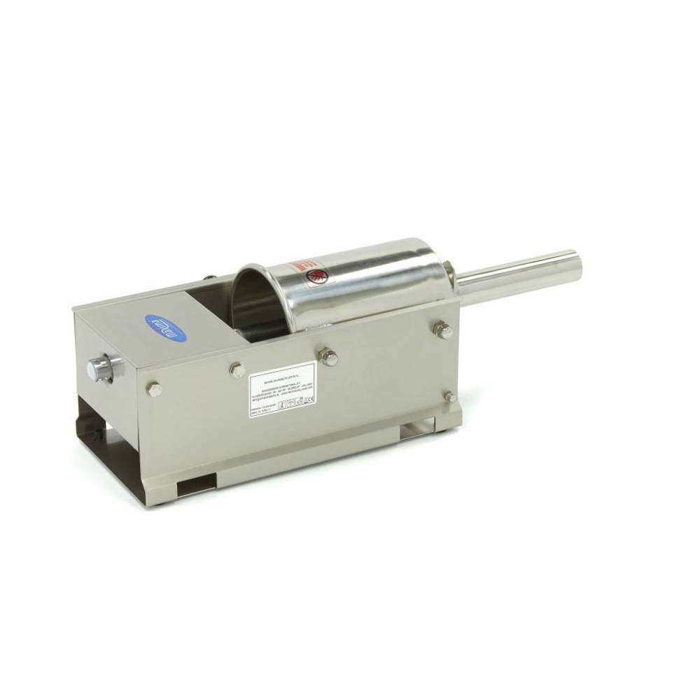 Tento horizontální plnič klobás má objem 3 litry, který umožňuje přípravu lahodných klobás. Tento výrobník klobás má dvě rychlosti a dodává se se čtyřmi plnicími trubkami. Má nerezový kryt, základní desku, hřídel a lisovací desku pro snadné čištění. Ideální pro řeznictví nebo restaurace.