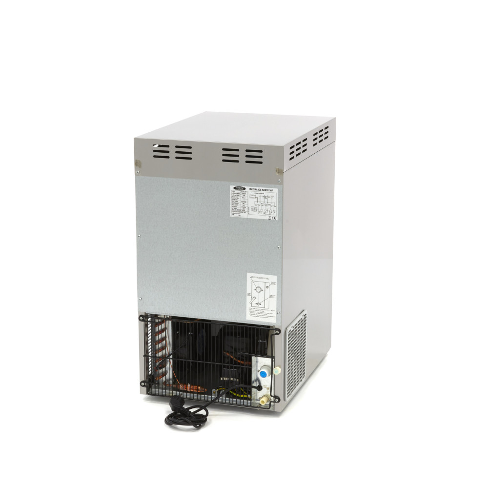 S tímto vzduchem chlazeným výrobníkem ledu můžete během 24 hodin vyrobit 50 kg drceného ledu. Připojením výrobníku ledu k přívodu pitné vody se zásobník na vodu automaticky naplní. Má zásobník na 10 kg drceného ledu a je ideálním řešením pro přepravu potravin, aby zůstaly čerstvé, nebo pro prezentaci vašich výrobků.