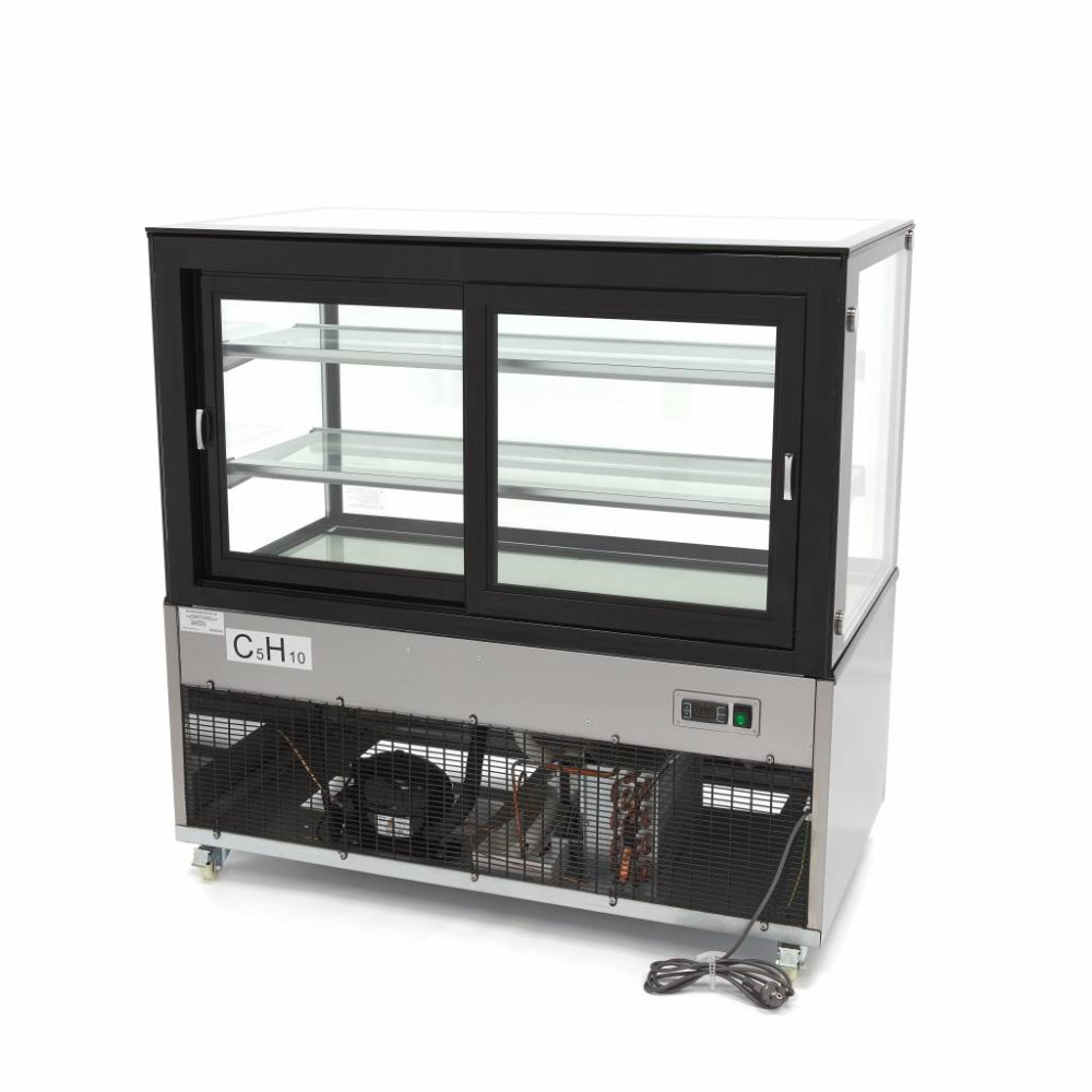 Dobrá pekárna, brasserie nebo kavárna potřebuje chladicí vitrínu, která udrží potraviny v chladu. Tato vitrína na pečivo v černé barvě a z nerezové oceli vyzařuje luxus a je vhodná k atraktivní prezentaci vašich výrobků. Občerstvení, pečivo a dorty jsou dobře viditelné díky zabudovanému energeticky úspornému LED osvětlení uvnitř. Chladicí vitrína má skleněné stěny a dveře a je vybavena dvěma skleněnými policemi, které jsou výškově nastavitelné. V zadní části chladničky jsou posuvné skleněné dveře pro snadný přístup k vystaveným výrobkům.