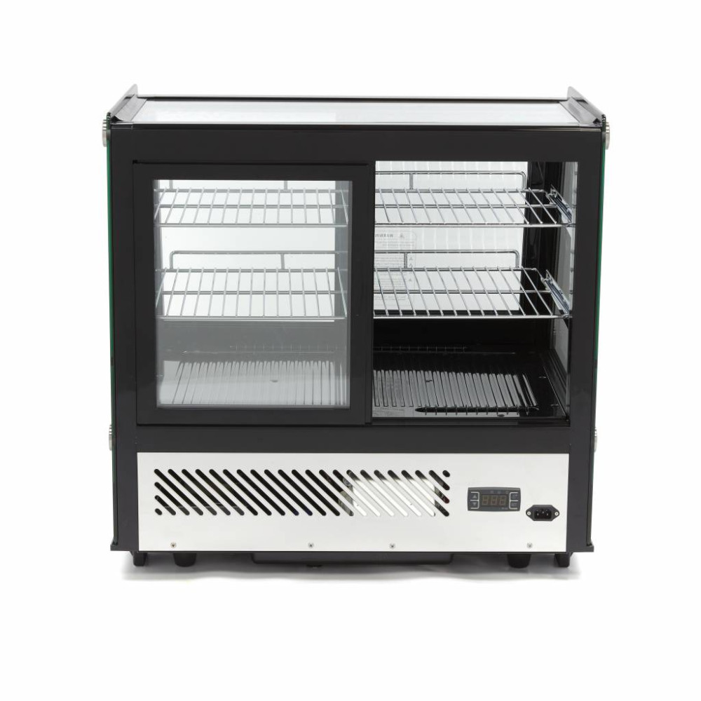 Tato černá chladnička s vitrínou má objem 125 litrů a je vybavena posuvnými dveřmi vpředu a vzadu. Snadný přístup k doplňování výrobků nebo k jejich odnášení. Má dvě nastavitelné police, LED osvětlení na vnitřní straně a digitální displej. Ideální pro použití v samoobslužných zařízeních veřejného stravování nebo potravinářských provozovnách.