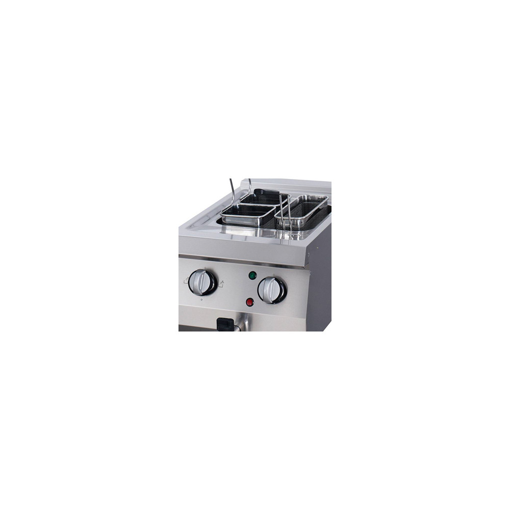 Tento vařič těstovin Heavy Duty má objem 20 litrů a je vybaven třemi nerezovými koši pro samostatnou přípravu různých druhů těstovin. Nerezový kryt a vypouštěcí kohoutek pro vyprázdnění nádoby usnadňují čištění. Je ideální pro umístění do 700 mm hluboké varné linky a pro použití v profesionálních gastronomických kuchyních.