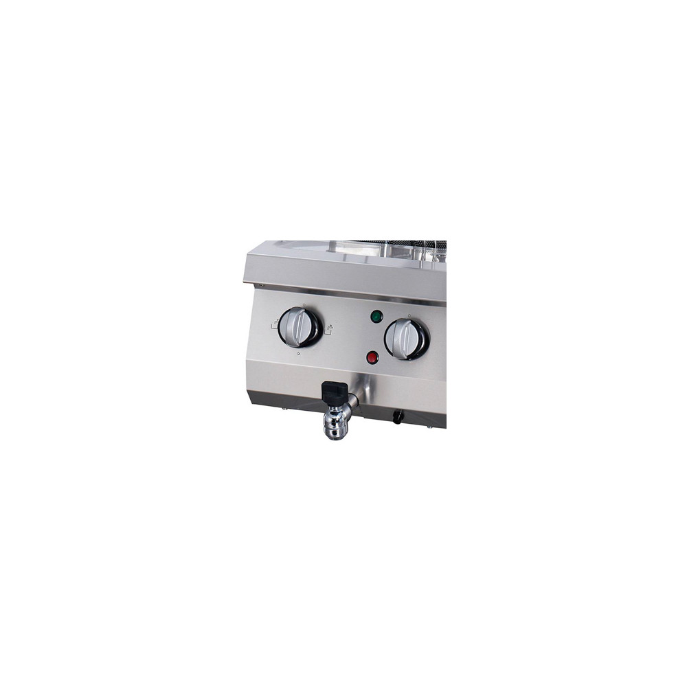 Nerezová nádoba na vodu má zaoblené rohy a horní část vařiče těstovin je bezešvě svařena. Nádrž na vodu lze plnit přes přívod studené vody pomocí elektromagnetického ventilu. Pro výměnu vody na vaření použijte ruční otočný knoflík pro snadné a rychlé odčerpání vody. Díky bezpečnostnímu termostatu můžete nastavit teplotu v rozmezí 30° až 110 °C. Profesionální vařič těstovin můžete postavit na stůl nebo pracovní stůl. Spotřebič lze také instalovat do varné linky.