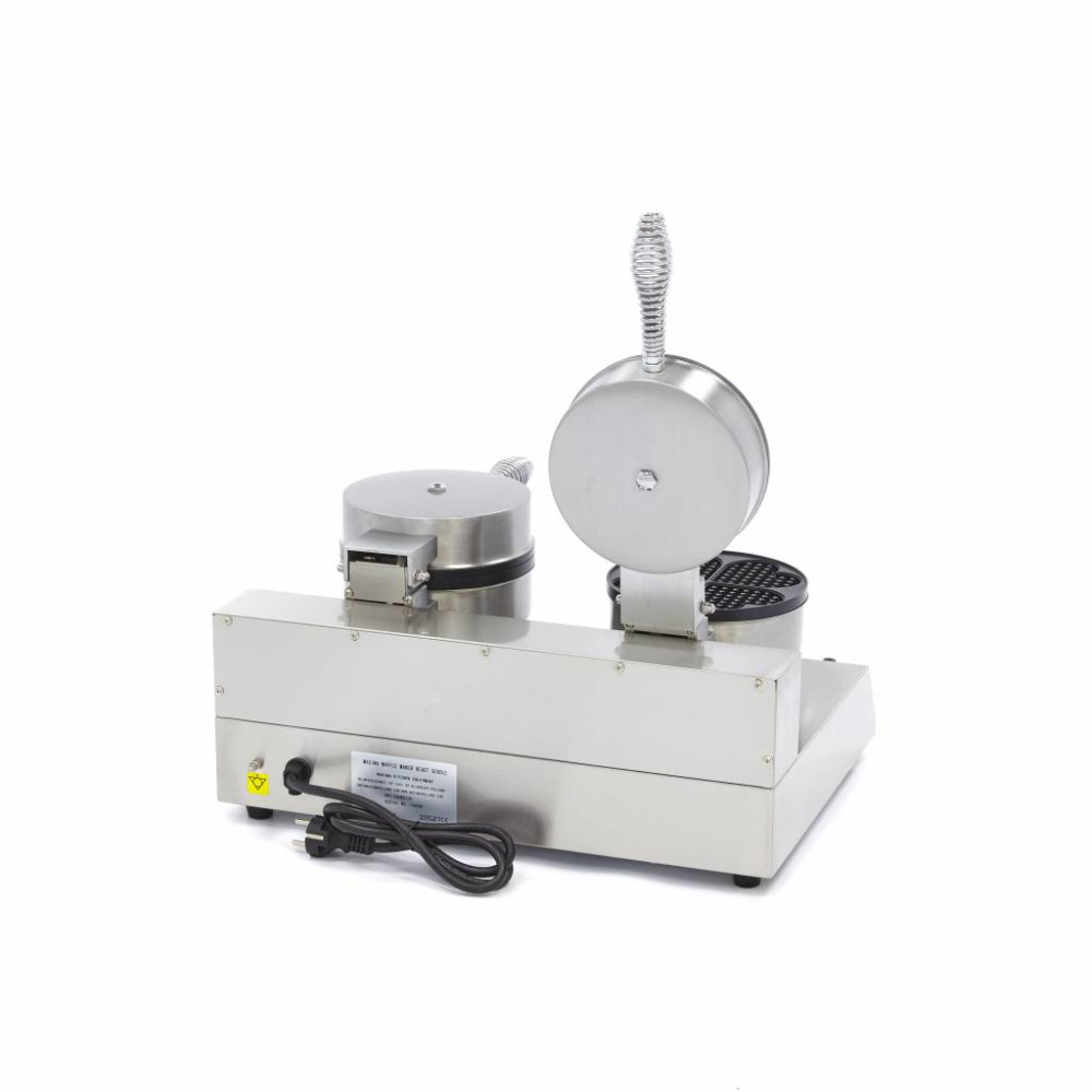 S tímto profesionálním dvojitým vaflovačem můžete připravit osm vaflových srdcí najednou. Má kryt z nerezové oceli a nepřilnavou hliníkovou pečicí desku. Analogový ovládací panel má robustní knoflíky pro nastavení teploty a časovače. Je ideální na veletrh, trh, do restaurace nebo kavárny.