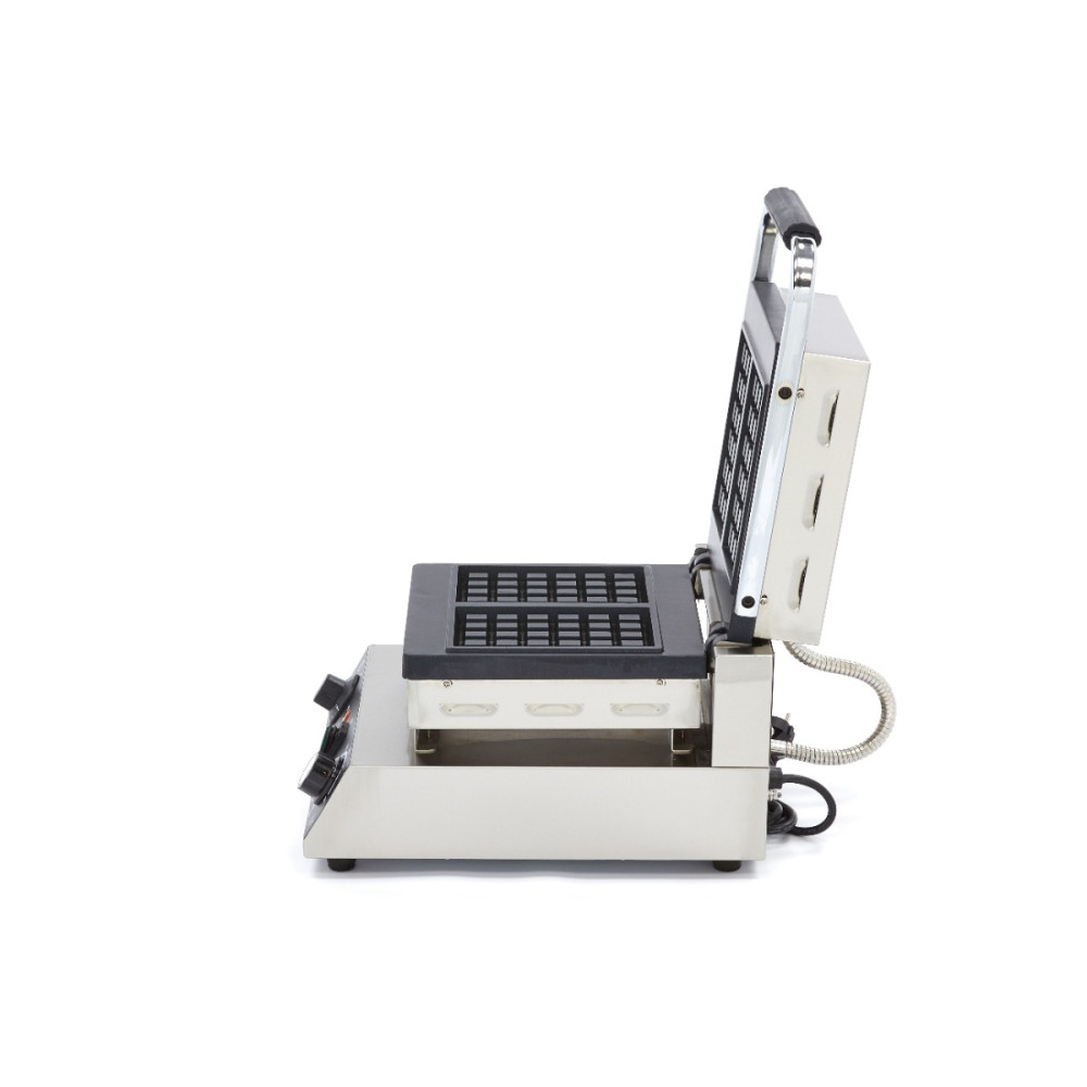 Tento vysoce kvalitní vaflovač pro gastronomii má klasický tvar, který je vhodný pro přípravu belgických vaflí. Díky uživatelsky přívětivému termostatickému ovládání teploty si můžete zvolit libovolnou teplotu v rozmezí 50 až 300 ºC. Můžete tak snadno a rychle připravit dvě vafle najednou. Rozsvícení oranžové kontrolky signalizuje, že se plotýnky zahřívají. Jakmile kontrolka zhasne, můžete začít vařit. Časovač vám pomůže zajistit, aby se vafle nepřipálily, ale měly správný stupeň křupavosti a barvy. Hliníkové plotýnky mají nepřilnavý povrch, takže vafle vycházejí dokonale.