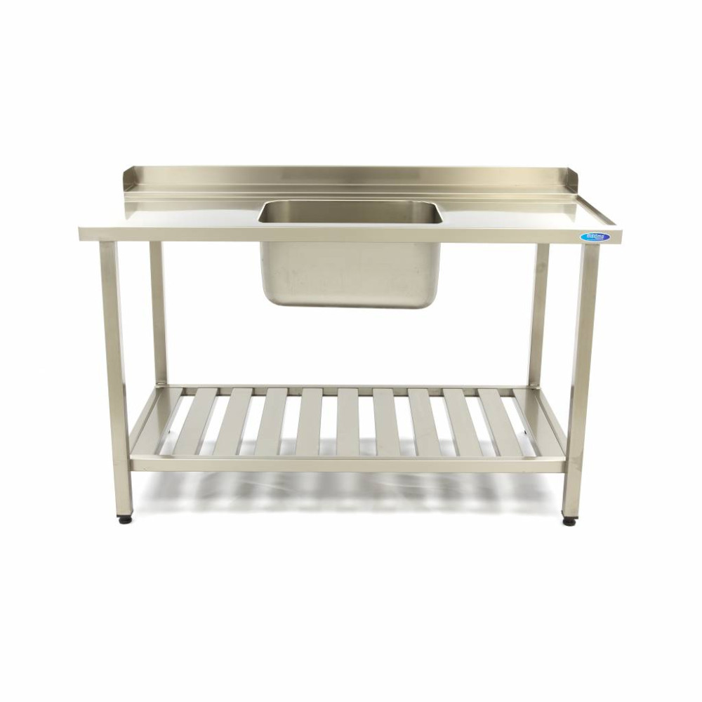 Tento profesionální stůl na mytí nádobí s dřezem je vyroben z vysoce kvalitní nerezové oceli a má praktickou boční a zadní stěnu. Na spodní straně dřezu je police na odkládání předmětů, například košů do myčky a mycího prostředku. Tento stůl s myčkou nádobí má uprostřed dřez.