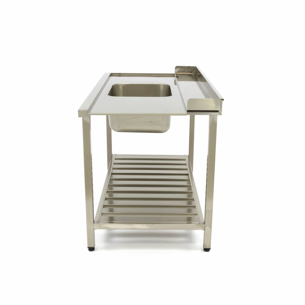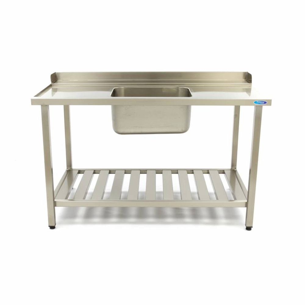 Tento profesionální stůl na mytí nádobí s dřezem je vyroben z vysoce kvalitní nerezové oceli a má praktickou boční a zadní stěnu. Na spodní straně dřezu je police na odkládání předmětů, například košů do myčky a mycího prostředku. Tento stůl s myčkou nádobí má uprostřed dřez.