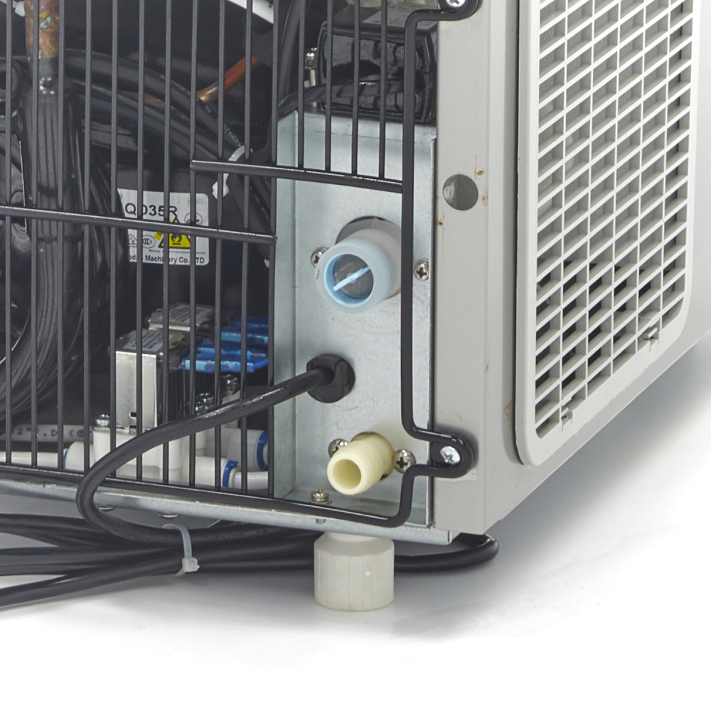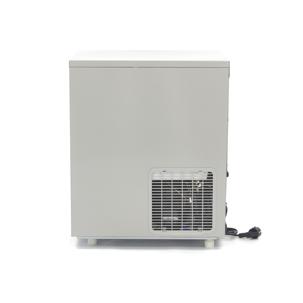 Tento profesionální výrobník ledu je vzadu chlazený vodou, takže jej lze používat i v teplých místnostech nebo venku. Na ovládacím panelu se nachází řada kontrolních světel, která vás upozorní na naplnění zásobníku, příliš nízkou hladinu vody nebo na případné chyby či poruchy. To je důležité, abyste přesně věděli, jaká opatření je třeba přijmout, aby výroba kostek ledu mohla co nejdříve pokračovat. Výrobník ledu je navíc vybaven ochranou proti přetížení, takže můžete bezpečně pokračovat v práci a nemusíte se obávat přetížení spotřebiče. Účinný chladicí systém zajišťuje, že kostky ledu jsou dobře tvarované a kvalitní. Chladivo používané v tomto zařízení je R290. Tento profesionální výrobník ledu je dodáván s přívodními hadicemi, které je třeba připojit k přívodu pitné vody. Výrobník ledu není vybaven vypouštěcím čerpadlem. Vypouštěcí hadice by měla být připojena níže, než je výstupní otvor stroje.