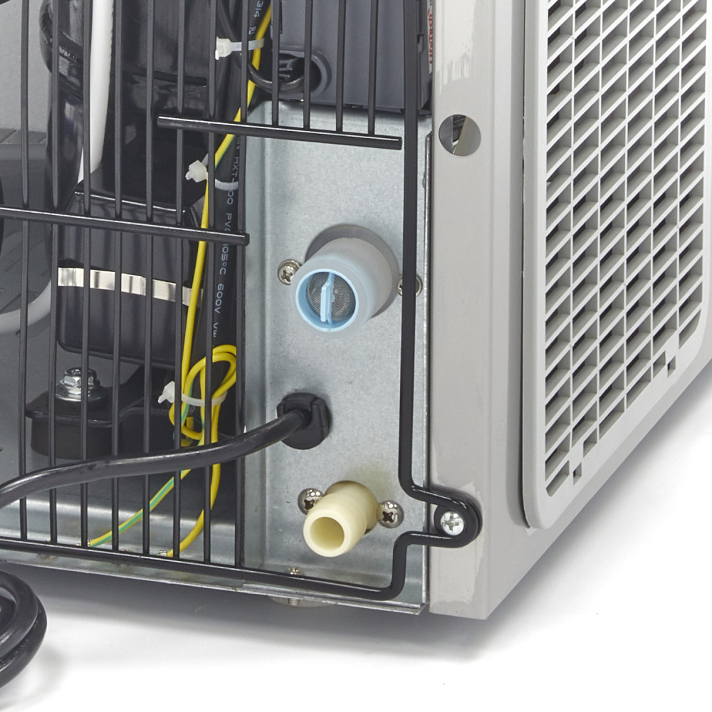 Dobře izolovaný a hygienický stroj na led zajišťuje kvalitní kostky ledu. Aby nedošlo k přetížení výrobníku ledu, je vybaven speciální ochranou proti přetížení. Součástí dodávky jsou různé hadice a příslušenství potřebné k připojení stroje k přípojce pitné vody. Díky tomu není nutné ruční doplňování vody. Výrobník ledu není vybaven vypouštěcím čerpadlem. Vypouštěcí hadice by měla být připojena níže, než je výstupní otvor stroje. K chlazení spotřebiče se používá účinný chladicí systém s chladivem R290. Součástí balení je také praktická naběračka na led. Tento spotřebič je vybaven ovládacím panelem s výstražnými kontrolkami signalizujícími případné poruchy, plnou zásobní nádrží a nízkou hladinou vody.