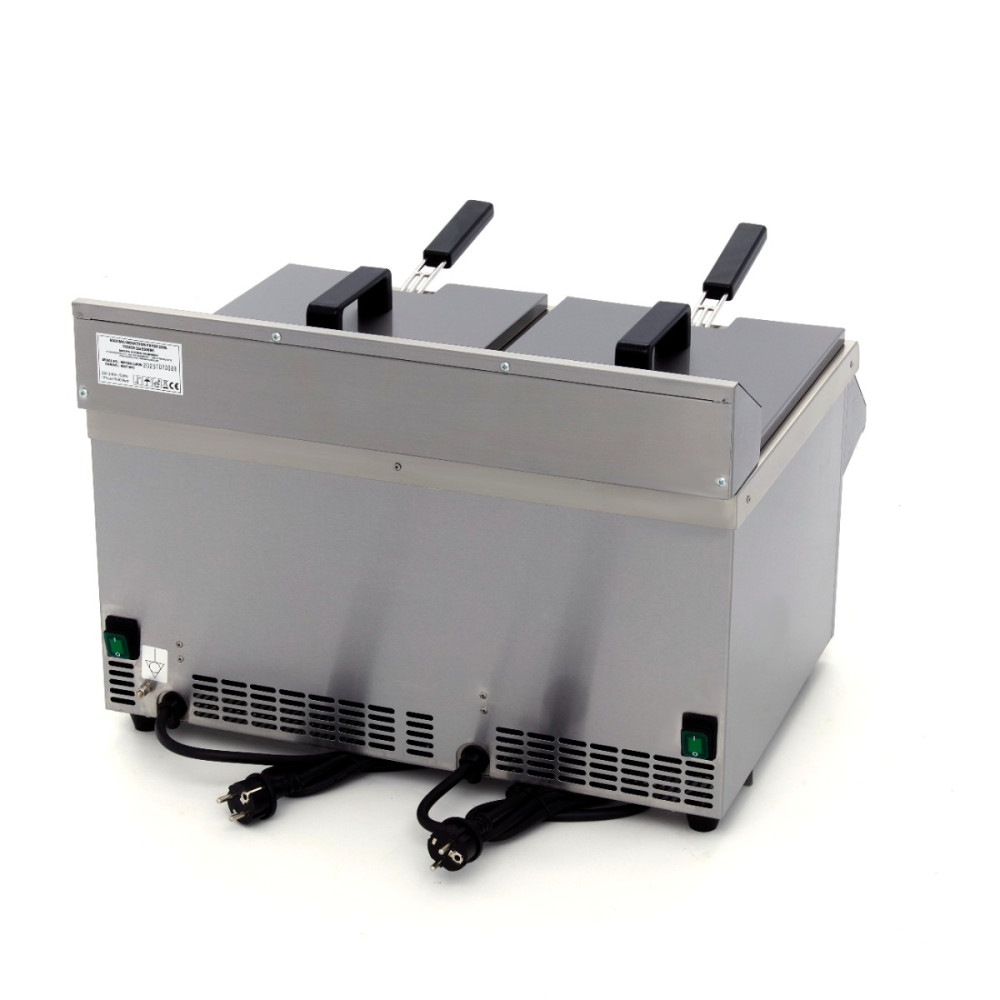 Tato dvojitá indukční fritéza má dvě nádrže o objemu 8 litrů. Je vybavena dvěma koši, takže můžete smažit občerstvení i hranolky najednou. Na LED displeji s dotykovým panelem můžete nastavit termostat a časovač. Vypouštěcí kohoutek usnadňuje výměnu oleje nebo čištění fritézy.