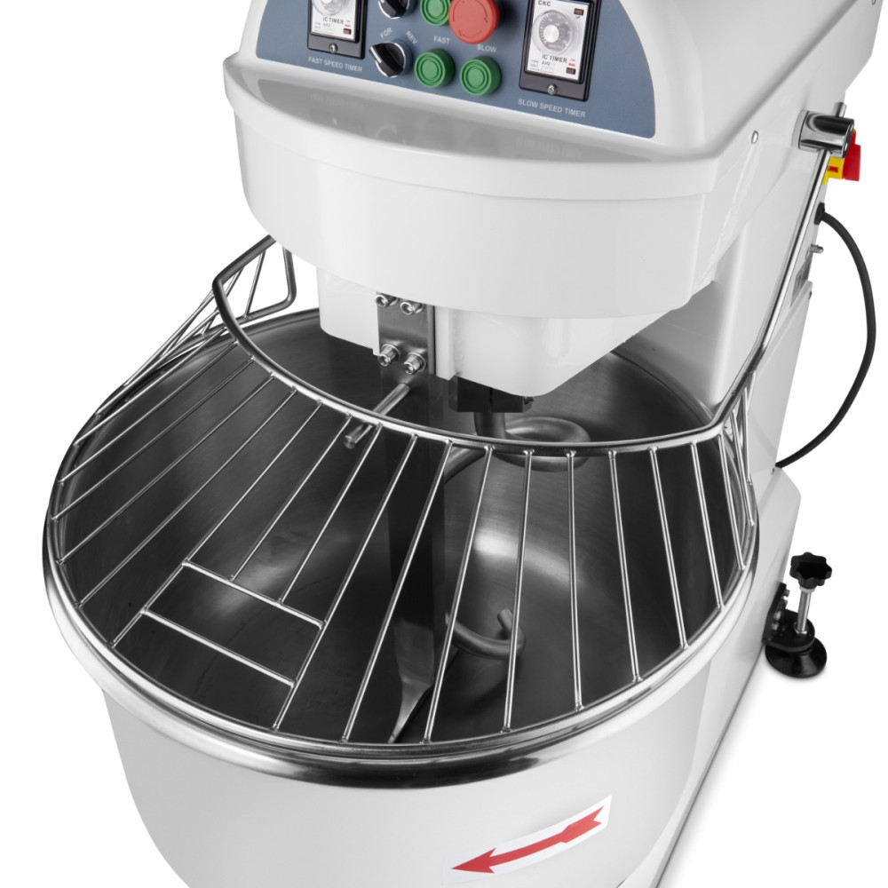 S tímto profesionálním míchadlem na těsto se 130litrovou mísou můžete uhníst až 80 kg těsta. Má jednoduchý ovládací panel se dvěma rychlostmi, časovačem a několika bezpečnostními prvky, jako jsou bezpečnostní spínače a ochranný kryt. Míchadlo na těsto má kovový kryt s povrchovou úpravou a je dodáváno s nerezovým hákem a pevnou míchací mísou.