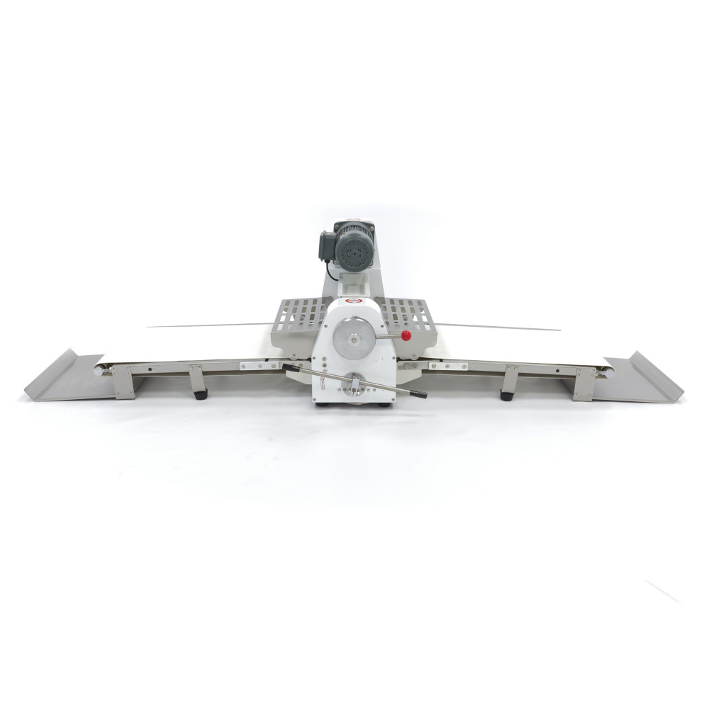 S touto profesionální stolní řezačkou na těsto můžete zpracovávat velké množství těsta se základnou až 52 cm. Je vybaven velkým dopravním pásem a rukojeťmi pro nastavení požadované tloušťky a pro průchod těsta válcem. Je skládací, takže se hodí do rušných kuchyní a pekáren s malým prostorem.