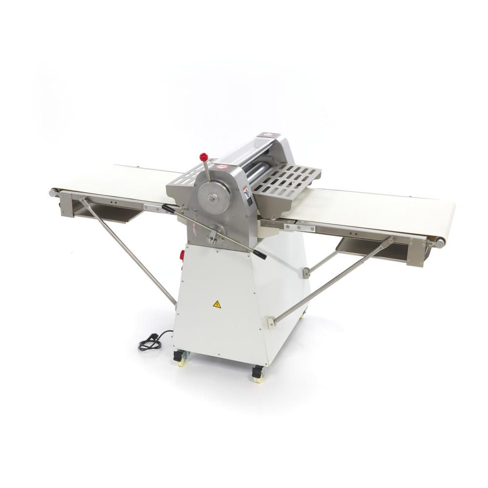 S tímto profesionálním podlahovým modelem řezačky těsta můžete zpracovávat velké množství těsta se základnou až 52 cm. Je vybaven velkým dopravním pásem a rukojeťmi pro nastavení požadované tloušťky a pro průchod těsta válcem. Je skládací, takže se hodí do rušných kuchyní a pekáren s malým prostorem.