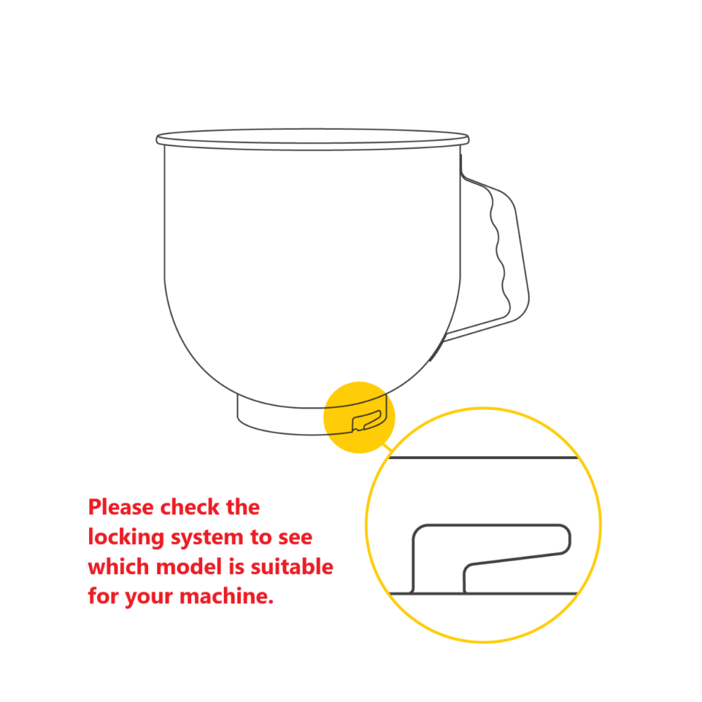 Upozornění: tato mísa má jiný systém uzamykání než model 2. Pečlivě zkontrolujte, který model je vhodný pro váš stroj. Na druhém obrázku výrobku je zřetelně vidět uzamykací mechanismus.