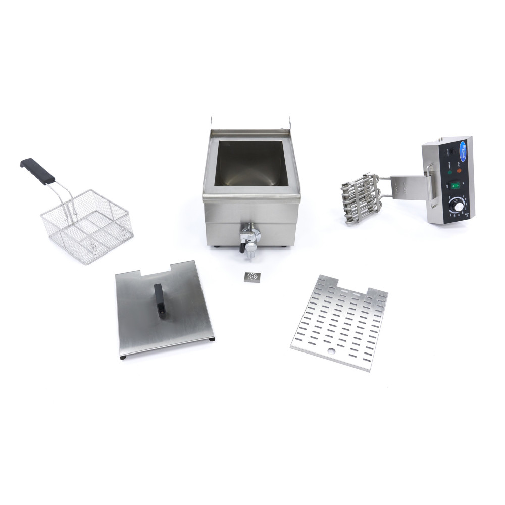Tato velká fritéza z nerezové oceli s objemem olejové nádrže 10 litrů je vhodná pro rozsáhlé použití v gastronomické kuchyni. Fritéza je vybavena košem, ochrannými topnými tělesy a praktickým vypouštěcím kohoutem, takže starý olej lze snadno a rychle vyměnit.
