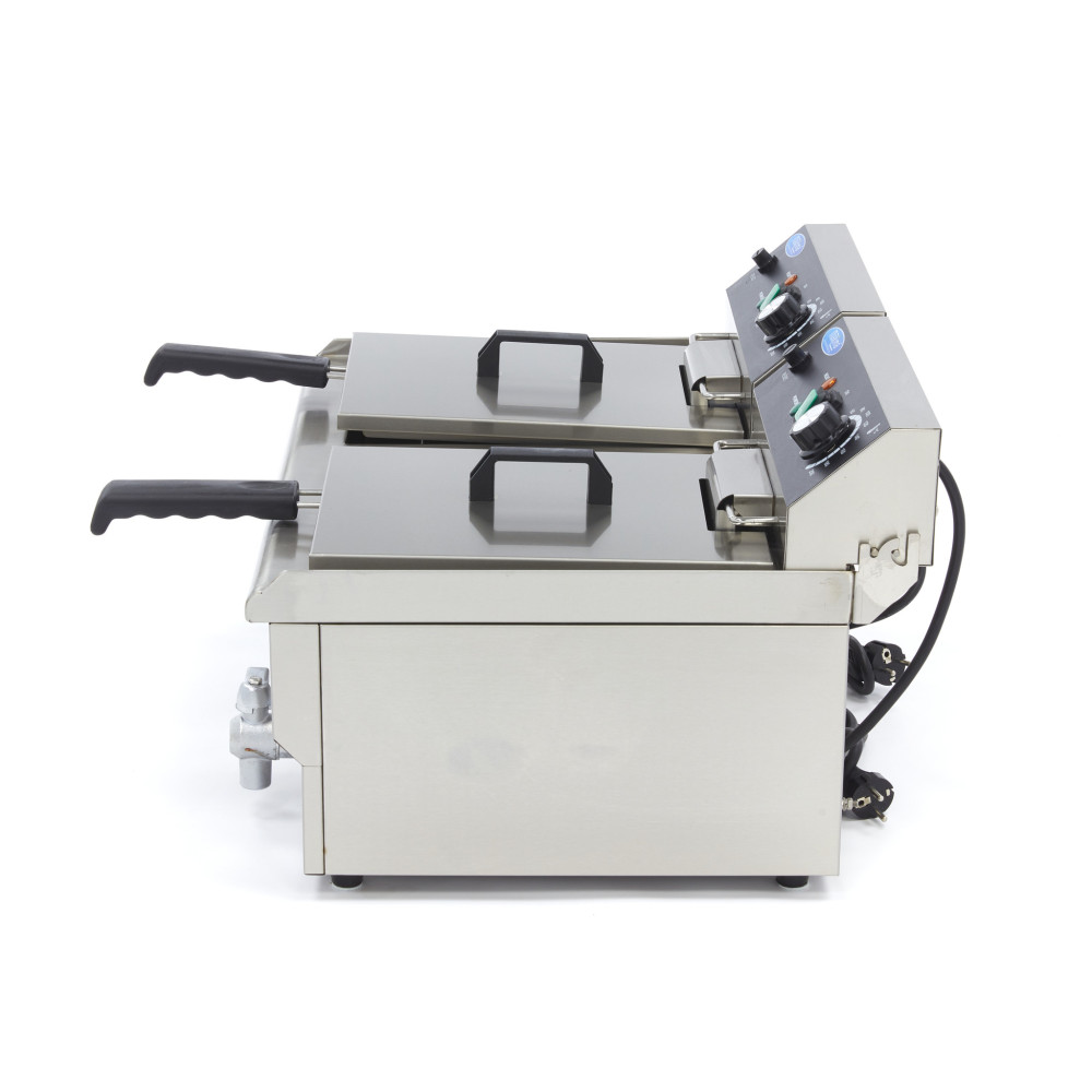 Tato profesionální dvojitá fritéza s kapacitou dvou nádrží na olej 13 litrů je ideální pro přípravu velkého množství občerstvení a hranolků. Je vybavena dvěma velkými koši, oddělenými termostaty, ochrannými topnými tělesy a studenou zónou. Výměna oleje je snadná díky praktickému vypouštěcímu kohoutku.