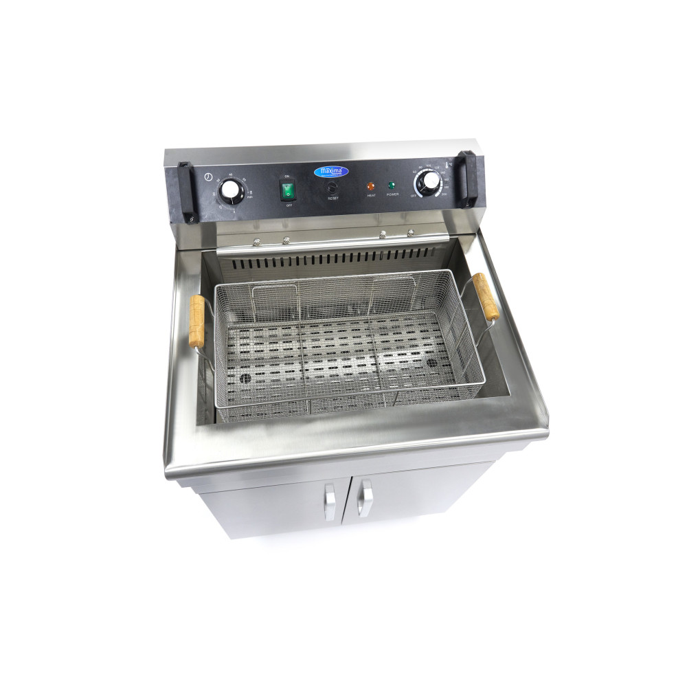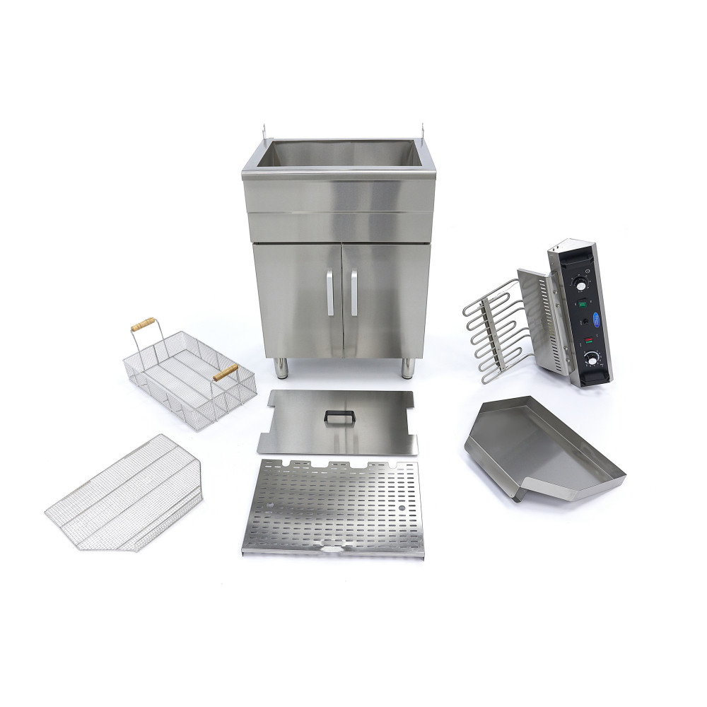Pokud chcete smažit velké množství hranolek, občerstvení, zeleniny, ryb nebo jiných předmětů, pak je tato univerzální fritéza s kapacitou 35 litrů ideální. Hodí se do každé gastronomické kuchyně, kde probíhá rozsáhlé smažení. Fritéza se dodává s nerezovou skříní. Díky tomu můžete v kuchyni snadno vytvořit další kapacitu, aniž by zabírala místo na pracovní desce nebo stole. Spodní skříň je vybavena dvěma nerezovými dvířky s úchyty. K základně je připojen vypouštěcí kohout, abyste mohli rychle vyměnit olej. Další fritovací olej můžete uložit uvnitř. Fritéza je dodávána s odnímatelným víkem a všechny úchyty jsou žáruvzdorné. Zbytky po fritování se shromažďují v přiložené mřížce, kterou lze snadno připevnit k fritéze.