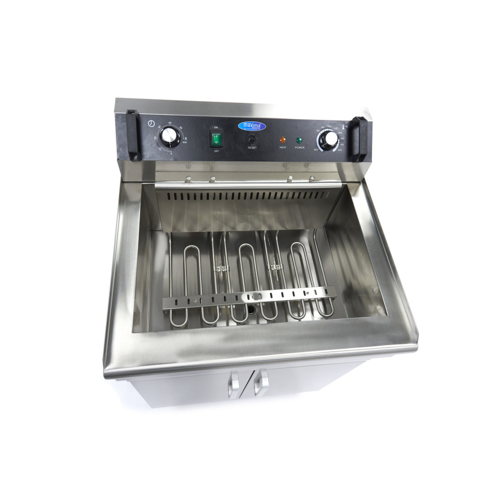 Tato profesionální extra velká fritéza pracuje s napájením 400 V a je vybavena ochranou proti přetížení. Díky studené zóně můžete fritovací olej používat déle. Topné těleso je umístěno několik centimetrů nad dnem fritézy. Protože olej není pod topným tělesem tak horký, drobky se méně rychle připalují. Olej tak zůstává déle čerstvý a nemusíte ho tak často měnit. Pomocí termostatu můžete nastavit teplotu v rozmezí 50 °C až 200 °C. K dispozici je také praktický časovač, takže potraviny se smaží přesně ve správný čas.