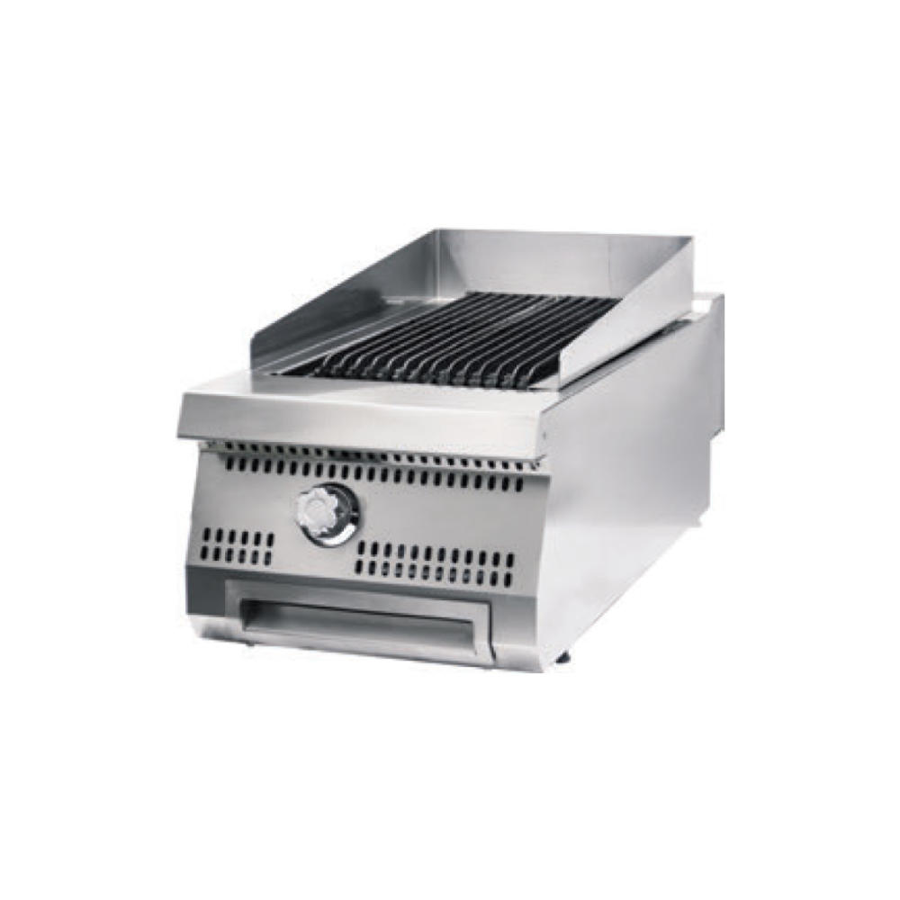 Gril Premium chargrill funguje na plyn a na rozdíl od běžných grilovacích desek ohřívá prostor pod grilovací deskou. Pod šikmým horním roštem se nachází litinový grilovací rošt, který rovnoměrně rozvádí teplo a zajišťuje shromažďování tuku v odkapávací misce pod grilovací plochou. Gril na dřevěné uhlí je vybaven vysokými ochrannými kryty z nerezové oceli, které zabraňují rozstřiku oleje. Spolu s ergonomickým designem grilu na dřevěné uhlí je tak zajištěna příjemná a bezpečná práce. Nerezový kryt a blatníky se snadno čistí. Díky hloubce 900 mm může gril na dřevěné uhlí grilovat velké množství potravin najednou.