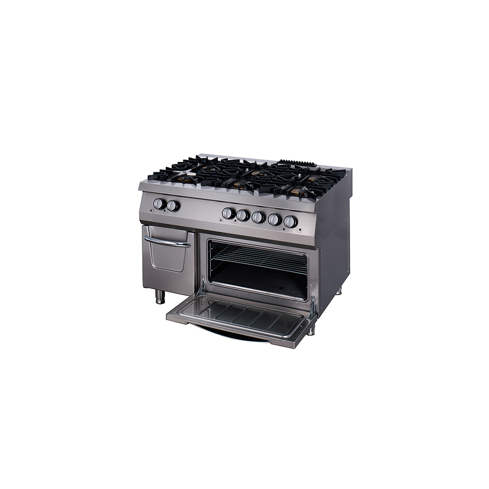 Pod sporákem se šesti hořáky se nachází prostorná trouba s třífázovým napájením (400 V). Statická komora trouby je vyrobena z nerezové oceli, přičemž dvířka jsou mimořádně těžká a mají tloušťku 40 mm. Uvnitř se nachází chromovaný rošt se třemi úrovněmi, na který můžete umístit nádoby o objemu 2/1 GN. Teplotu můžete nastavit v rozmezí 100 až 300 °C. Kromě trouby máte k dispozici také praktickou skříňovou základnu, která má dvířka s magnetickým zavíráním. Zde máte dostatek prostoru pro přehledné uložení například kuchyňského náčiní a pánví.