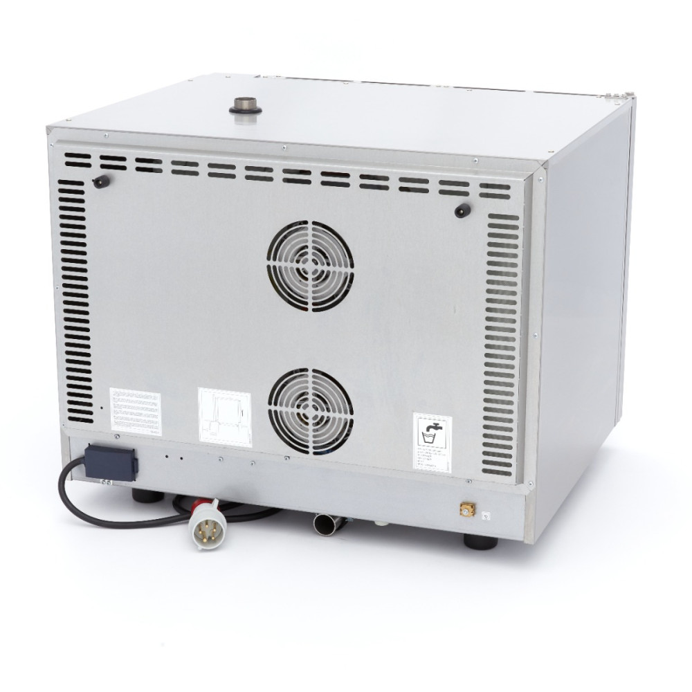 Tato kombinovaná parní trouba má výkonná topná tělesa z nerezové oceli, která zajišťují úplnou a účinnou distribuci tepla, takže maso a ryby se připravují rovnoměrně. n avíc je kombinovaná parní trouba vybavena dvěma ventilátory s funkcí zpětného chodu a dvojitým atermickým zasklením. Dvířka se velmi snadno nastavují a těsnění dvířek je vyrobeno z potravinářského silikonu. Díky vnitřnímu osvětlení snadno zjistíte, jak daleko jste v procesu pečení. Tento spotřebič je vybaven přívodem vody s ventilem pro výrobu páry a také vývodem vody. Jedná se o zcela přizpůsobitelný přístroj s jednoduchým analogovým ovládáním. K dispozici je tlačítko pro ovládání časovače, teplotního rozsahu a množství použité páry. K dispozici je také kontrolka teploty, která ukazuje, zda konvektomat dosáhl nastavené teploty. Poslední tlačítko slouží k nastavení regulace páry.