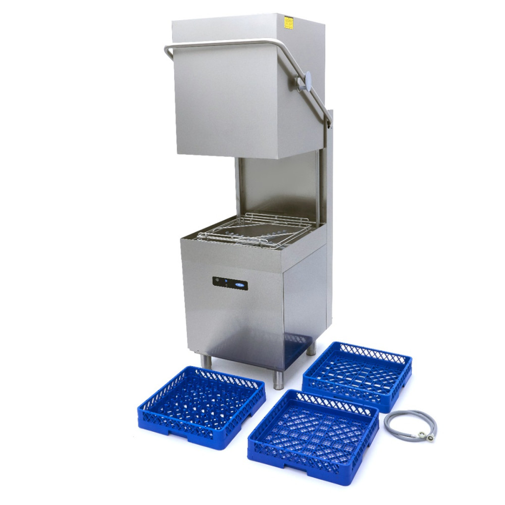 Tato výkonná průchozí myčka nádobí je ideální pro intenzivní každodenní používání ve větších stravovacích zařízeních. Díky velké mycí kapacitě, oplachovacímu čerpadlu a čerpadlu na mýdlo můžete mít špinavé nádobí čisté za méně než čtyři minuty. Dodává se s koši na sklo, talíře a příbory.