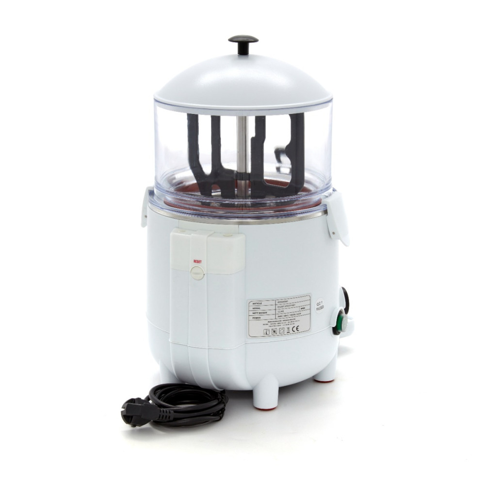 S tímto dávkovačem na bílou čokoládu snadno vydáte 5 litrů horké čokolády. Má také systém ohřevu bain marie, který zajišťuje, že se čokoládové mléko ohřívá postupně a nepřipaluje se. Díky kontinuálnímu rotačnímu míchacímu mechanismu je zabráněno tvorbě sraženin a ucpávání výpustného kohoutku.