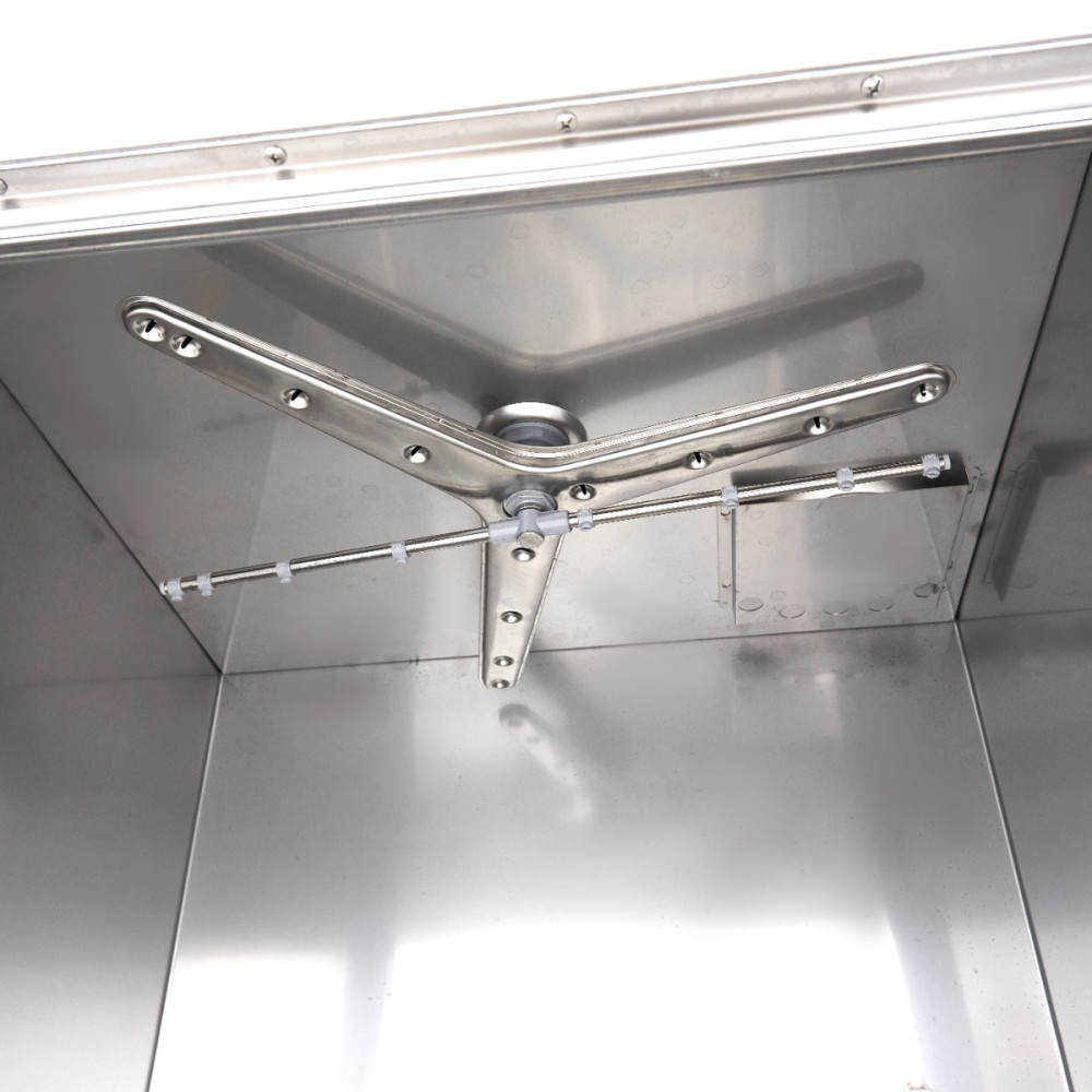 Díky plášti z nerezové oceli se tato odolná myčka hrnců snadno čistí. Nerezová ocel je také velmi odolná, takže váš spotřebič nebude náchylný k poškození nebo poškrábání. Mycí ramena jsou vyrobena ze speciálního ABS a lze je snadno čistit trochou mýdla a teplé vody. K čištění vnitřku použijte odvápňovací prostředek a speciální čisticí prostředek. Myčka hrnců se dodává bez oplachovací a mýdlové pumpy, ale prostřednictvím webových stránek lze objednat speciální sady. Součástí balení není vypouštěcí čerpadlo, protože voda odtéká přirozeně. Stačí zajistit, aby vypouštěcí hadice byla připojena níže než výpust.