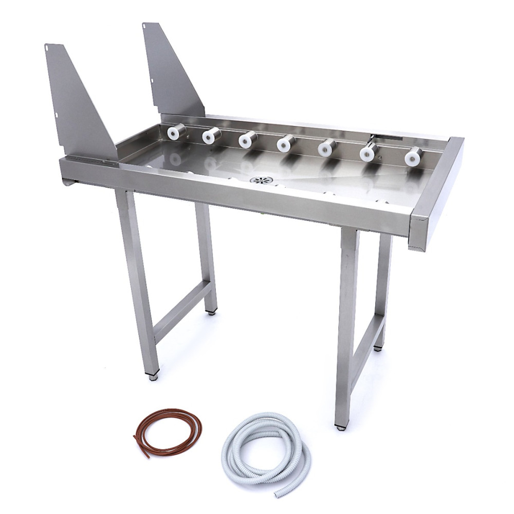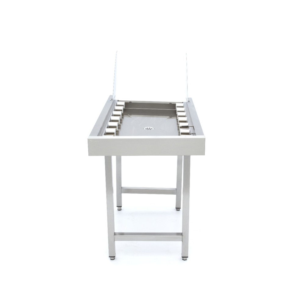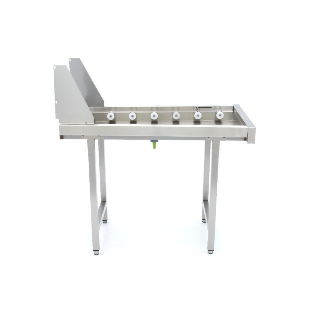 Tento válečkový stůl je vyroben z nerezové oceli, která je známá svou odolností a snadnými čisticími vlastnostmi. Připojený motor pohybuje válečky, což usnadňuje výstup čistého nádobí z myčky bez jakýchkoli komplikací.