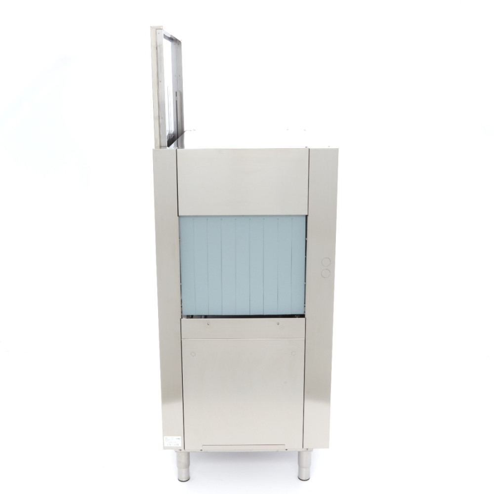 Tato myčka s regálovým dopravníkem je ideální pro mytí velkého množství nádobí, zejména během rušného dne. Stojany se špinavým nádobím rychle a snadno projdou regálovým dopravníkem, který je kompletně umyje a zanechá čisté a připravené k dalšímu použití. Tato komerční myčka nádobí má kapacitu pro mytí 60 až 120 regálů za hodinu. Lze ji rozšířit o nerezový stolek s válečky na levé straně myčky.