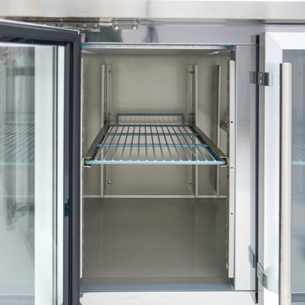 Tato prostorná chladicí pracovní deska má čistý objem 750 litrů a čtyři skleněné dveře, takže máte dostatek prostoru pro přehledné uložení všech surovin. Pultová chladnička se dodává se čtyřmi výškově nastavitelnými rošty a můžete k ní přidat i další rošty a GN nádoby.