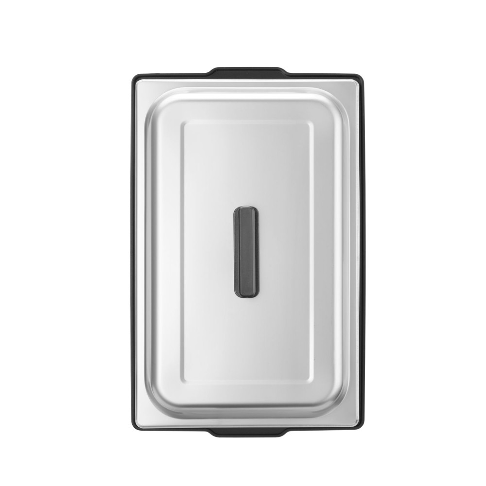 Model s nerezovým víkem, nádobou (vana + GN1/1-100) a nerezovým rámem s úchyty pro přenášení....