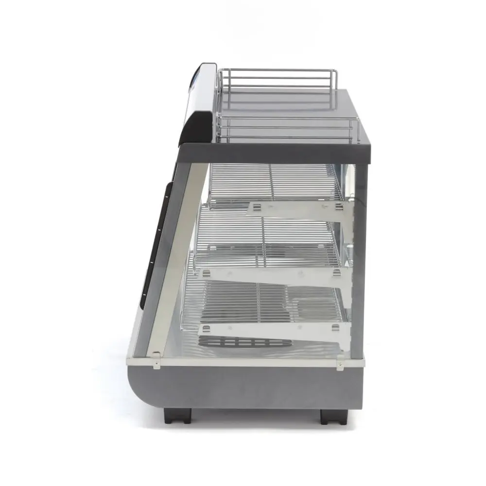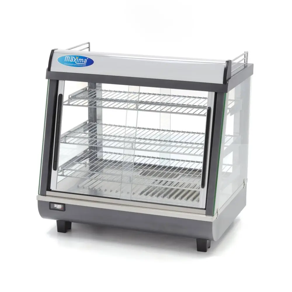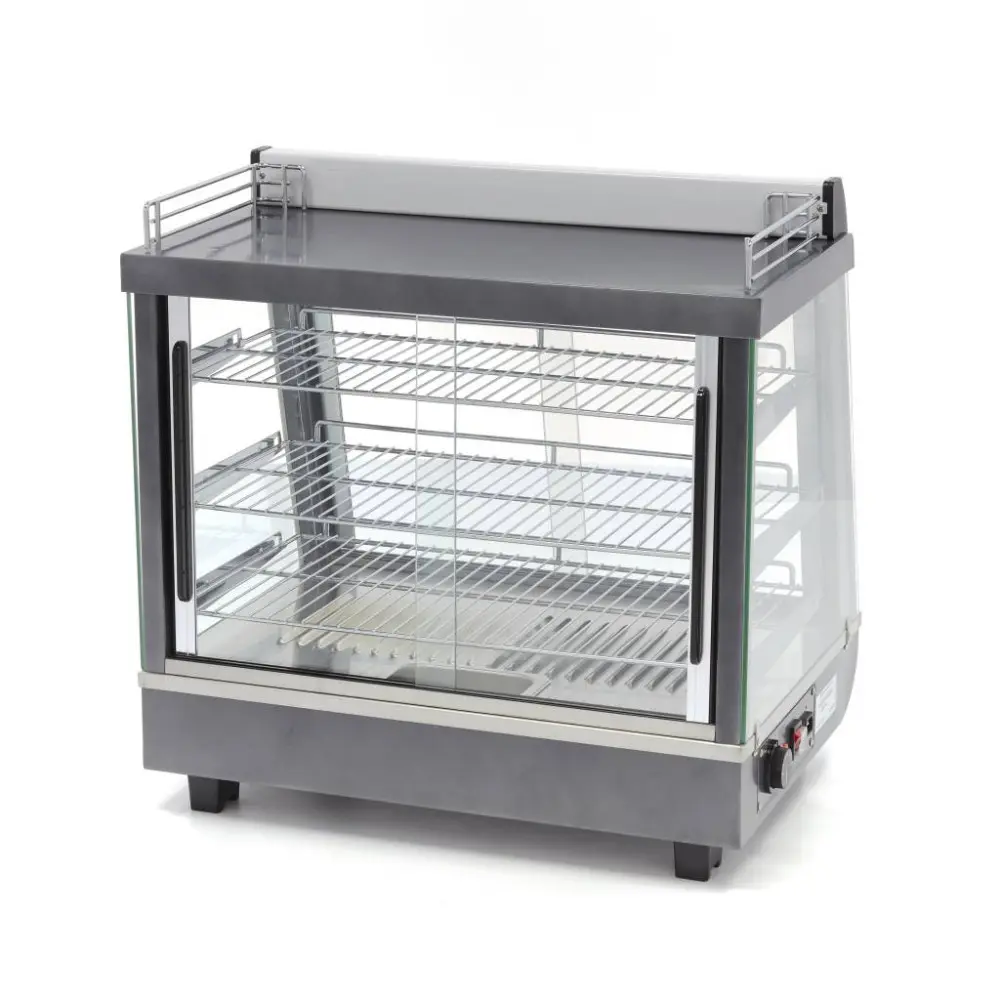 V horní části vitríny je prostor pro uložení kuchyňského náčiní. Držák na karty lze použít k propagaci výrobků ve vitríně. Díky výkonnému topnému tělesu je teplo rovnoměrně rozváděno po celé vitríně. Vyhřívaná vitrína na potraviny má tři nastavitelné chromované police. Teplotu lze snadno nastavit pomocí analogového knoflíku na teploty v rozmezí 30 až 90 ºC. Vestavěný zásobník vlhkosti zajišťuje, že výrobky ve vitríně příliš rychle nevysychají. Teplotu lze odečítat z přední části vitríny.