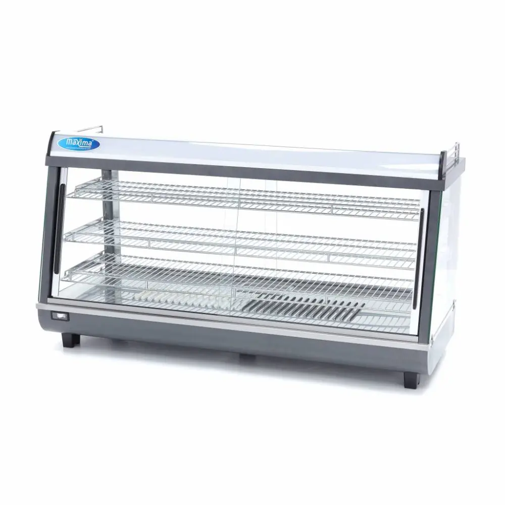 Připravujete hodně pokrmů, které je třeba udržovat delší dobu v teple? Pak použijte tento profesionální vyhřívaný stojan na potraviny o šířce 121,5 cm. Vyhřívaný stojan na potraviny má objem 186 litrů a je vybaven třemi výškově nastavitelnými chromovanými policemi. Skleněná skla pokrývají všechny strany vitríny a praktické LED osvětlení na vnitřní straně se postará o atraktivní prezentaci pokrmů. Vyhřívaná vitrína na potraviny je také vybavena držákem na karty pro reklamu vašich výrobků. Přední i zadní část vitríny má posuvná dvířka. Zákazníci si tak mohou pečivo, grilované pokrmy nebo občerstvení z vitríny sami vyndat. Obsluha tak může vitrínu snadno doplňovat.