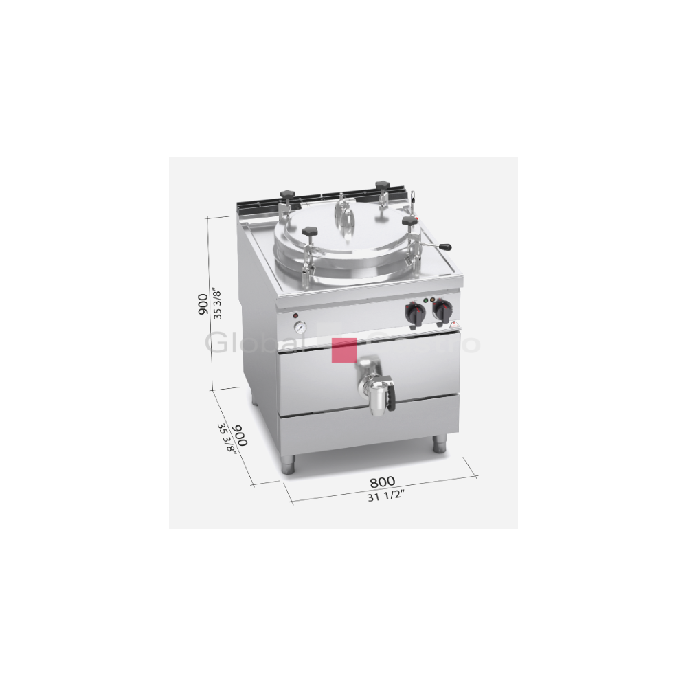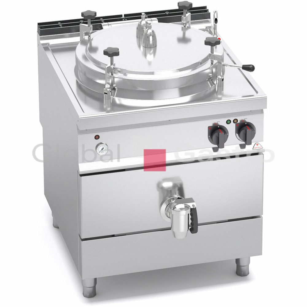 Tlakové víko s pojistným ventilem a pevnou kalibrací 0,05 bar, zajišťováno ručně stavitelnými šrouby. Nepřímý ohřev s nízkotlakou párou (0,5 bar) generovanou v měziplášti vybaveném bezpečnostním termostatem. Topné těleso je umístěno v ochraném pouzdře z nerez oceli. Mechanický ukazatel tlaku umístěný ve vnějším opláštění. Ovládání výkonu a regulace teploty pomocí termostatu.