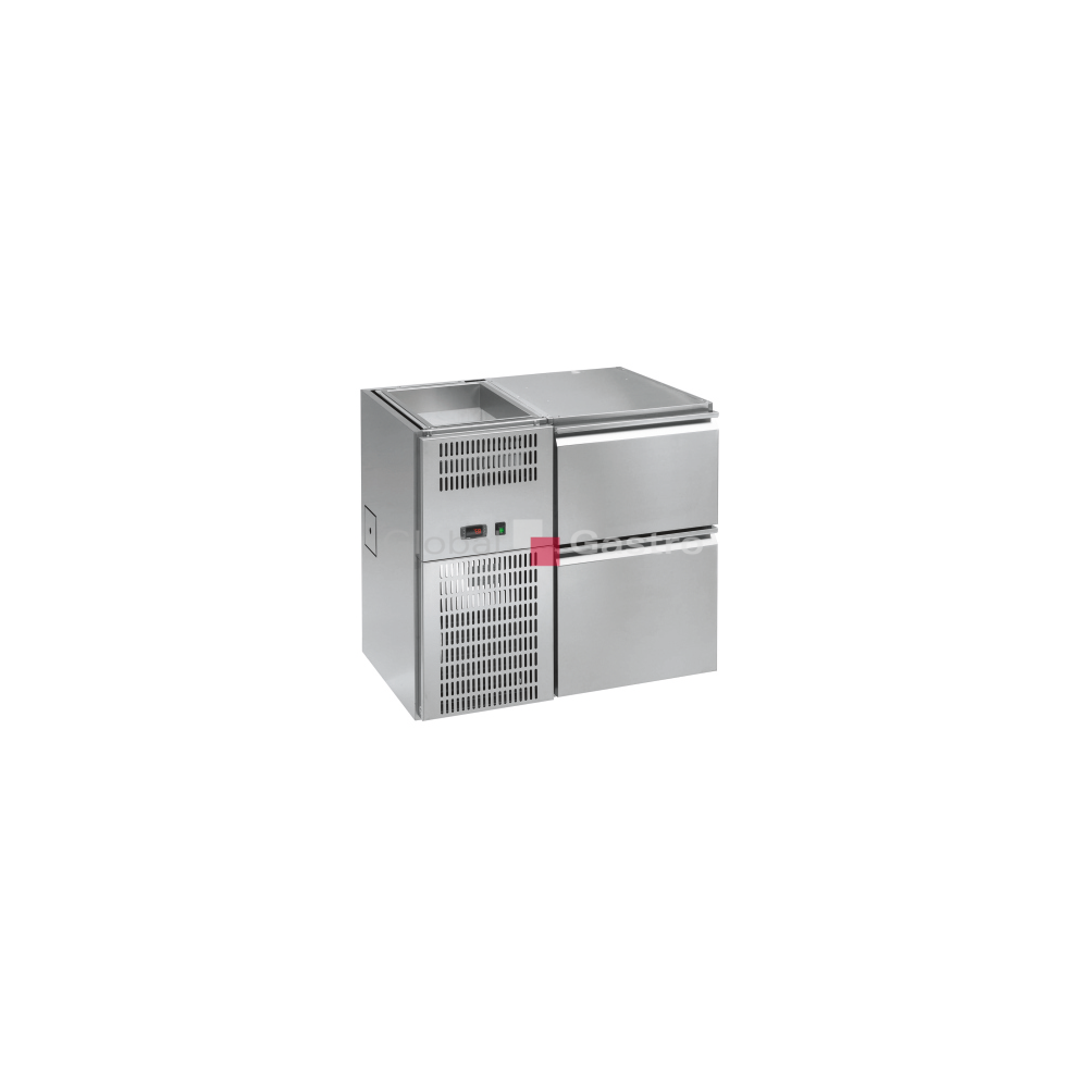 Chladicí barové stoly s chlazenou vanou nad agregátem REGD / REGS-110E, 102E, 220E, 212E a 204 E jsou určeny pro vestavění pod barovou desku (V základu se zákrytem a krycím rámečkem chlazené vany - bez pracovní desky!), jsou vyrobeny v celonerezovém provedení (AISI 304) s vestavěným agregátem, který je dle verze umístěn vpravo nebo vlevo. Digitální ovládání teploty společné pro chlazený prostor a vanu (příplatkově - STC - individuální ovládání teploty vany). Ventilované chlazení, automatické odtávání (připojení na odpad). Vybaveny hlubokými zásuvkami pro nápoje, nebo s dvířky (prostor pro Keg sud).