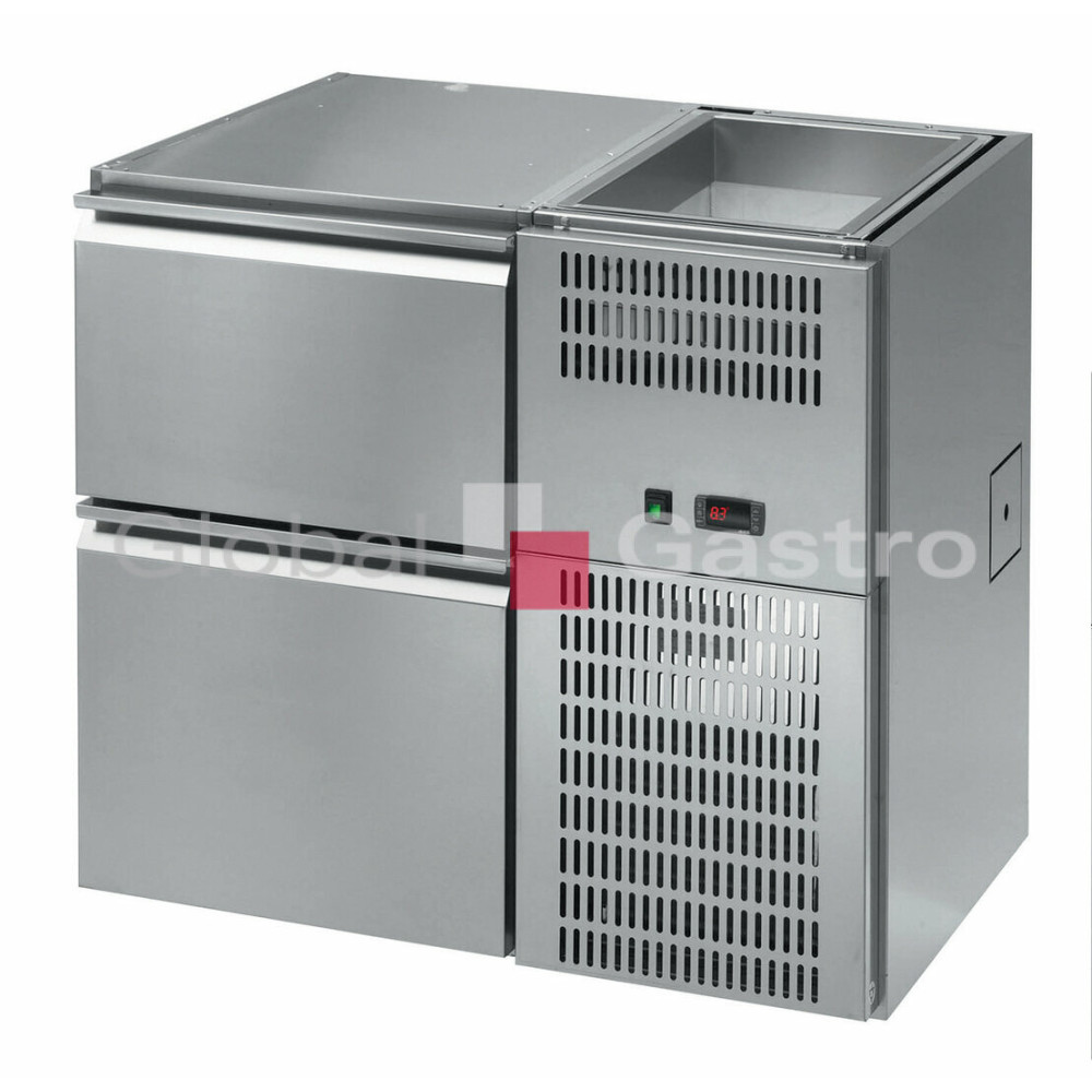Třísekcový barový chladící stůl. Model v celonerezovém provedení (AISI 304), s chlazenou vanou (312x515xh250) nad agregátem (vpravo/vlevo). Digitální ovládání, ventilované chlazení, aut.odtávání (připojení na odpad). Stoly ve standardu dodávány bez vrchní pracovní desky (viz.příslušenství). Umístění agregátu standardně vpravo (REGD) na objednávku možno umístit agregát vlevo (model REGS). Modely je možno dodat v provedení s dvouokruhovým systémem chlazení (samostatné nastavení teploty vany a spodního chladícího prostoru (dveře/zásuvky), případně ve výbavě LUXUS (masivní panty a zámky dveří/zásuvek).