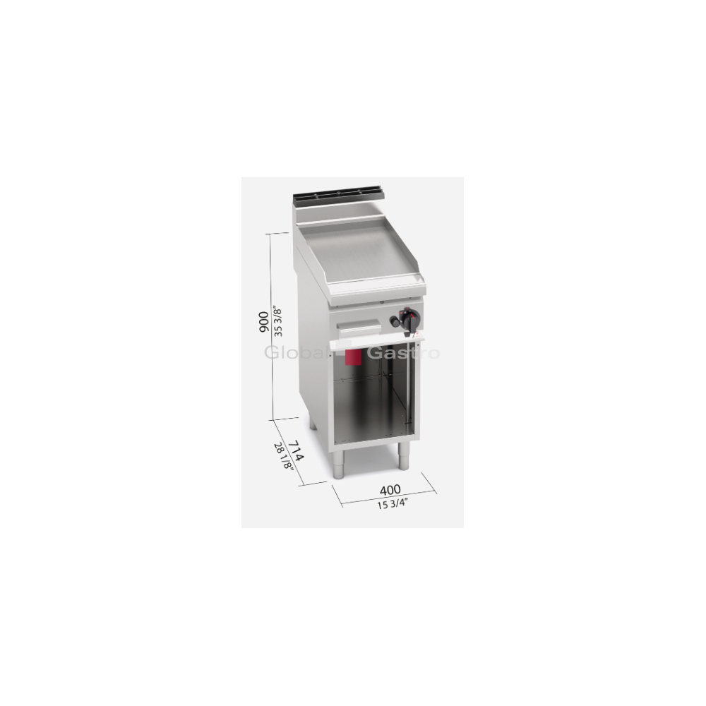 Zesílená grilovací deska s hladkým (rýhovaným) povrchem z oceli a zvýšenými postranními lemy. Topné těleso je umístěno pod grilovací plotnou. Regulační stupně umožňují nastavit teplotu 50-300°C. Kompaktní provedení s otevřeným podstavcem.