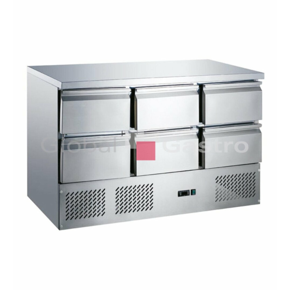 Celonerezové provedení se zásuvkami pro GN1/1 a vrchní nerezovou pracovní deskou bez zadního lemu. Rozsah teplot je 0 až 10°C.