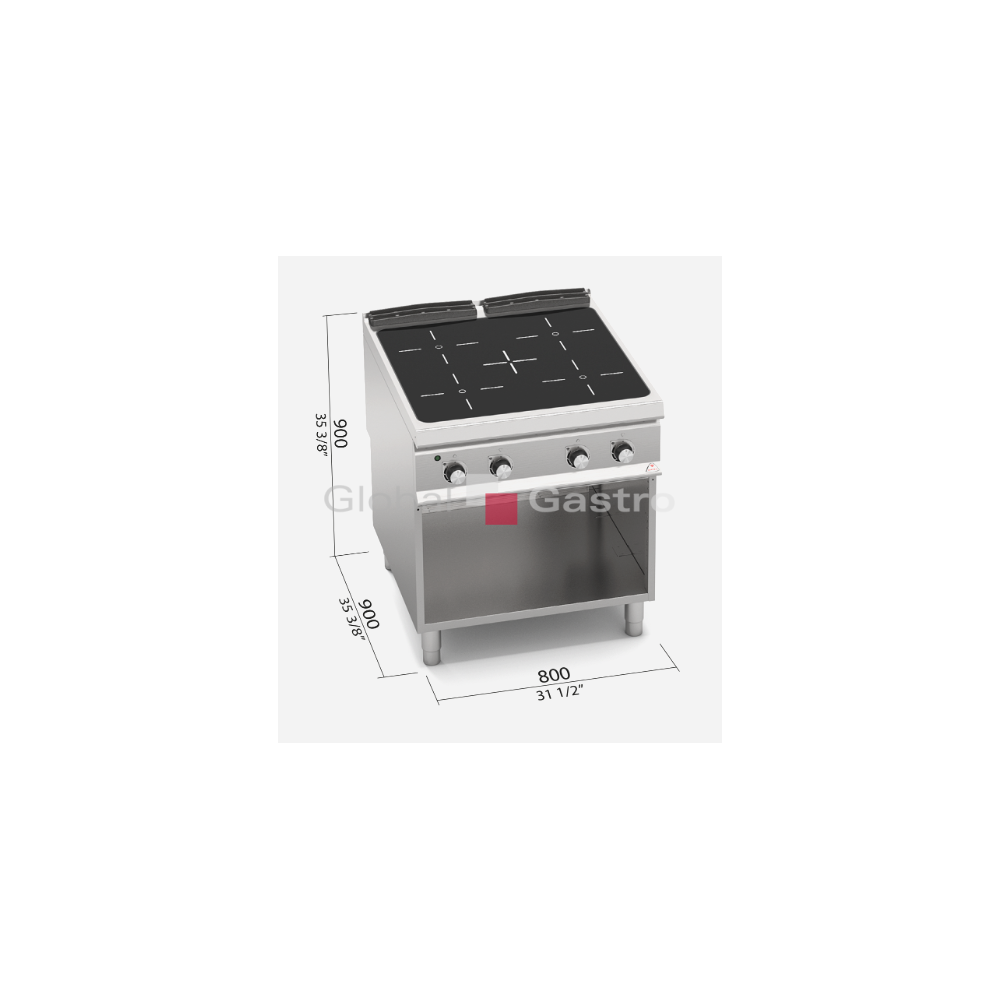 Keramická varná deska tloušťka 6 mm. Elektrická topná tělesa o Ø300 mm a výkonu 4kW dosahují při vaření v kruhových zónách vysokých teplot (do 500°C). Plochy zón jsou označeny speciálním serigrafem, dle kterého je určena správná poloha hrnce. Světelná signalizace zbytkového tepla do 60°C při vypnutí každé zóny pro ochranu uživatele. Kompaktní provedení s otevřeným podstavcem.