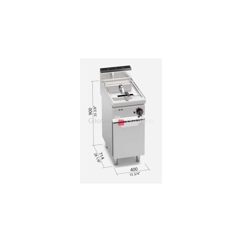 Elektrické a plynové fritézy z nerez oceli AISI 304. Jedna nebo dvě lisované vany se studenou zónou pro zachycení zbytků jídel. Přímý ohřev trubkovými hořáky ve vaně nebo elektrickými topnými spirálami, vybaveny bezpečnostní termostaty. Plynulé nastavení výkonu, nebo teploty do 190°C. Teoretický výkon 1 vana (plynová frytéza 25 kg/h a elektrická 30 kg/h). Dodáváno s křídlovými dvířky a jedním základním košem/vana (Příplatkově VYŠŠÍ VÝKON U ELEKTRICKÝCH MODELŮ 9 kW/2x 9kW, C2 = 2koše/vana).