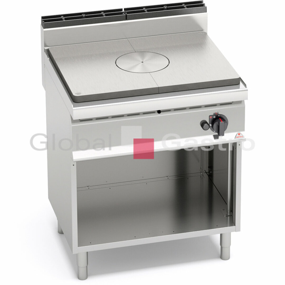 Plynový sporák s ocelovou plotnou velké tloušťky s rozdílnými oblastmi teplot: max. teplota na středu, klesající na okrajích. Ohřev zajišťuje střední litinový hořák 13kW s regulací výkonu. Zapalování hořáků věčným plamínkem. Kompaktní provedení s otevřeným podstavcem.